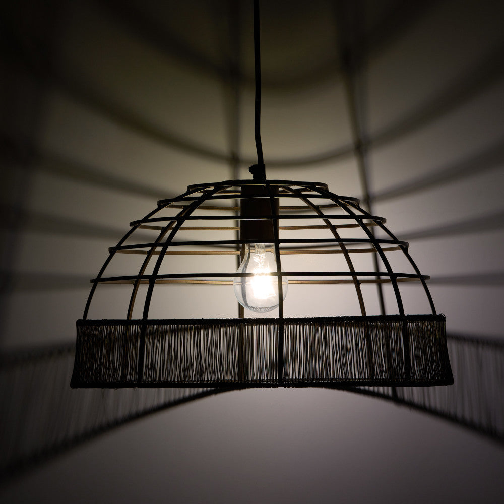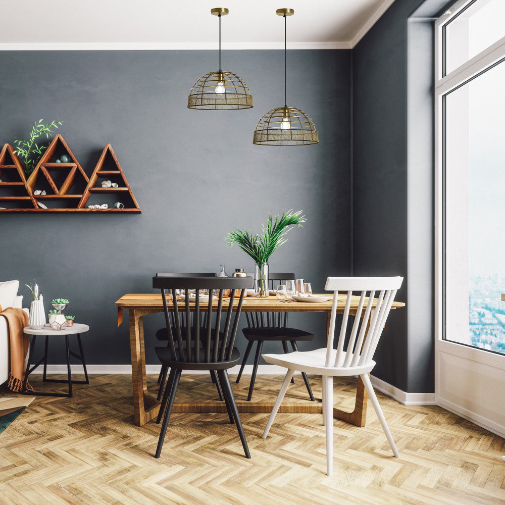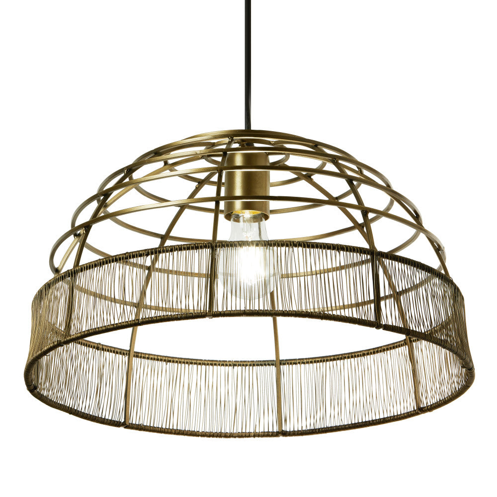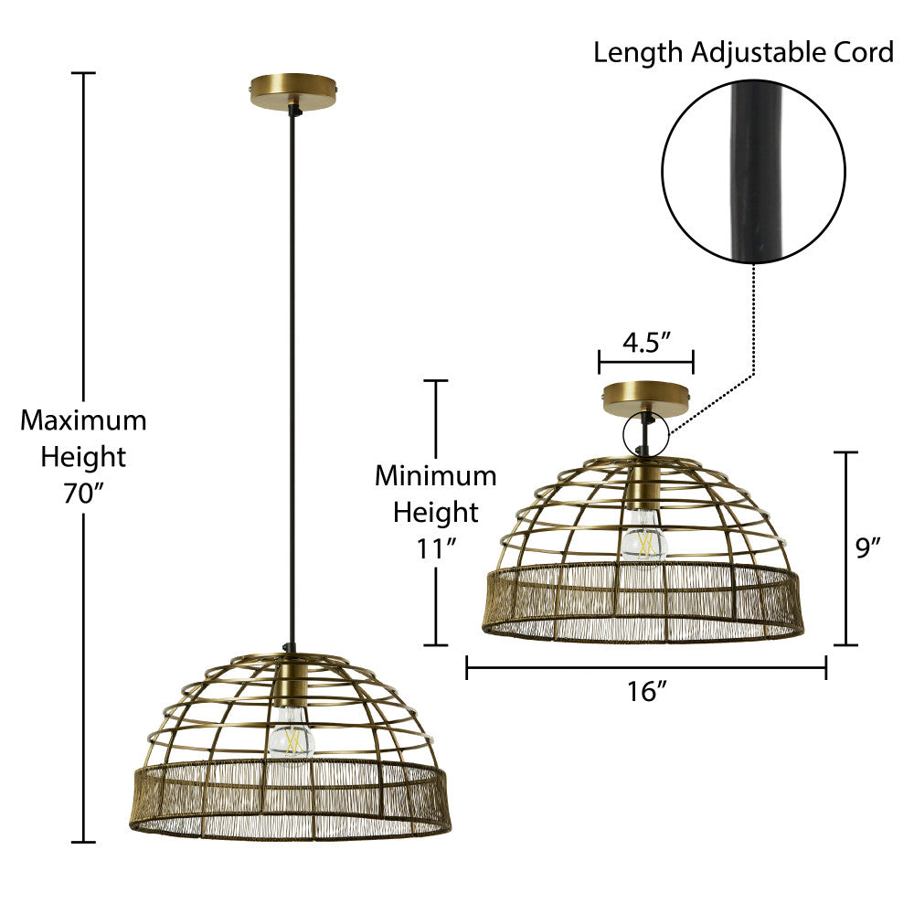 Introduce an industrial aesthetic into your space with this dome-shaped pendant light. Crafted from metal with a brass finish, this lighting fixture casts a downlight that creates a cozy and warm atmosphere in your room. The open cage design of the shade allows for an impressive display of light while its adjustable height ensures the perfect fit for your space. Ideal for kitchens, dining rooms, or entryways, this pendant light requires hardwiring and one 40 watt bulb, not included.