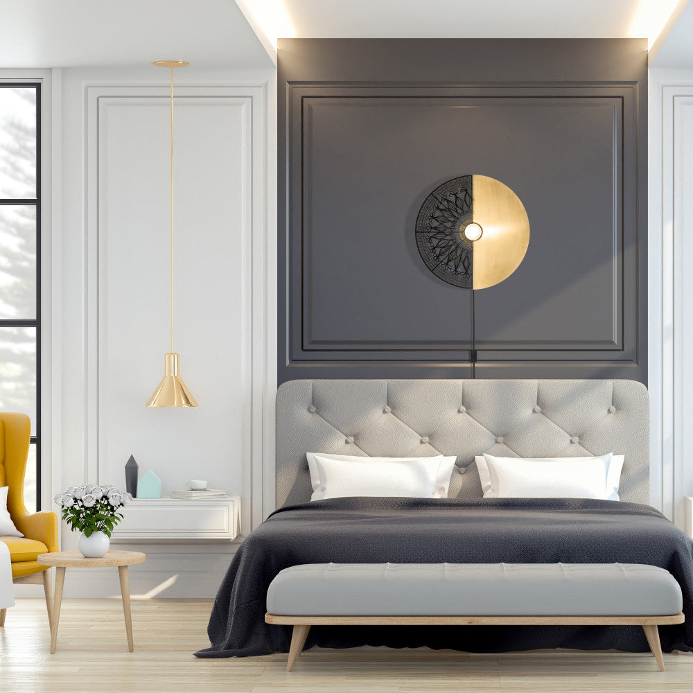 Enhance your indoor decor with this modern metal wall sconce featuring a unique black and gold design. The round flat disc shade presents an intriguing contrast with its gold metal accented by a black lace-like detail, making it a focal point in any room. The sconce requires a 40-watt A-type bulb, offering flexible lighting options to suit your ambiance. Ideal for accentuating your space with a modern aesthetic, this plug-in sconce is easy to install and perfect for any room.
