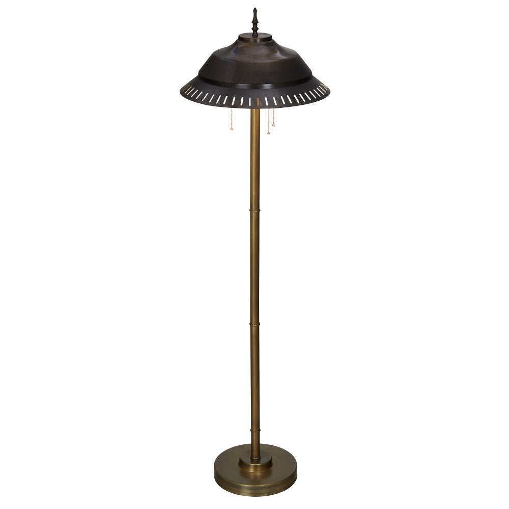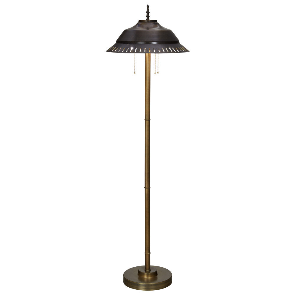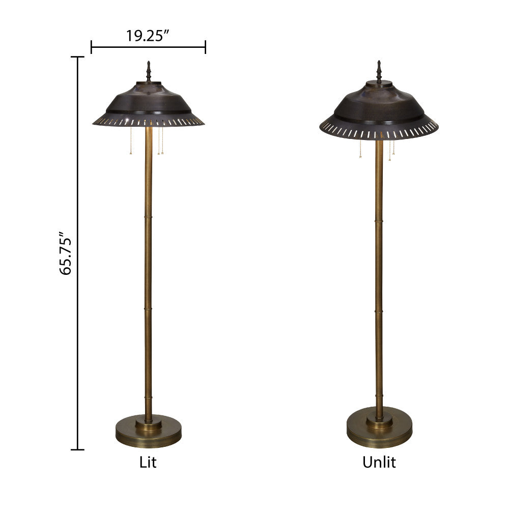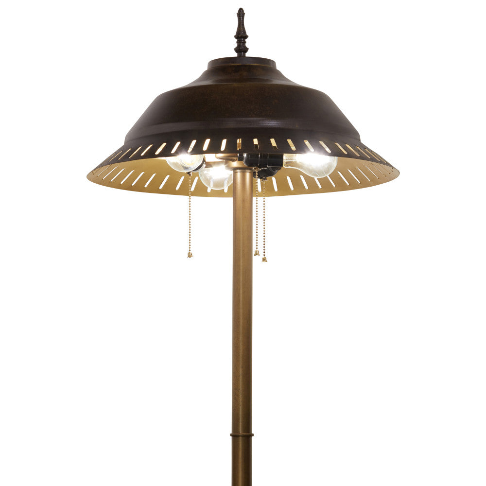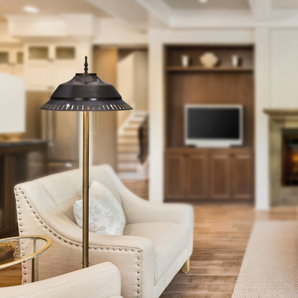Add stylish and functional lighting to any corner of your living room, home office and more with this charming candlestick-base metal floor lamp. Featuring a sleek shape and a cone-shaped shade, this floor lamp comes in a versatile antique bronze and gold metal finish that will complement industrial or transitional styles of home decor. The lamp requires three Type A bulbs up to 60 watts (not included). Plus, the design offers simple operation with three pull chains and a foot switch.