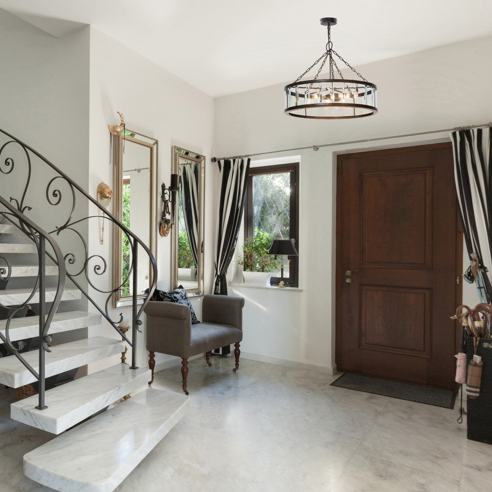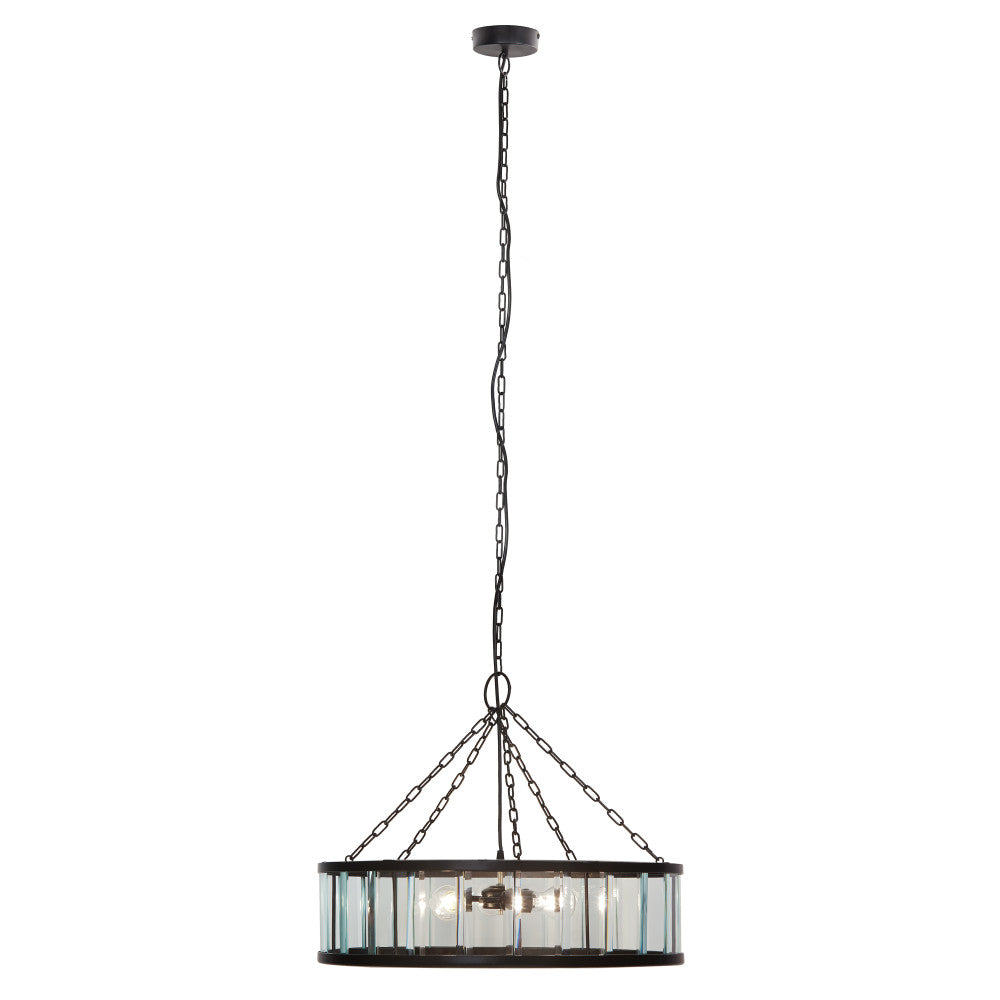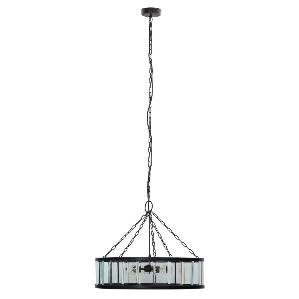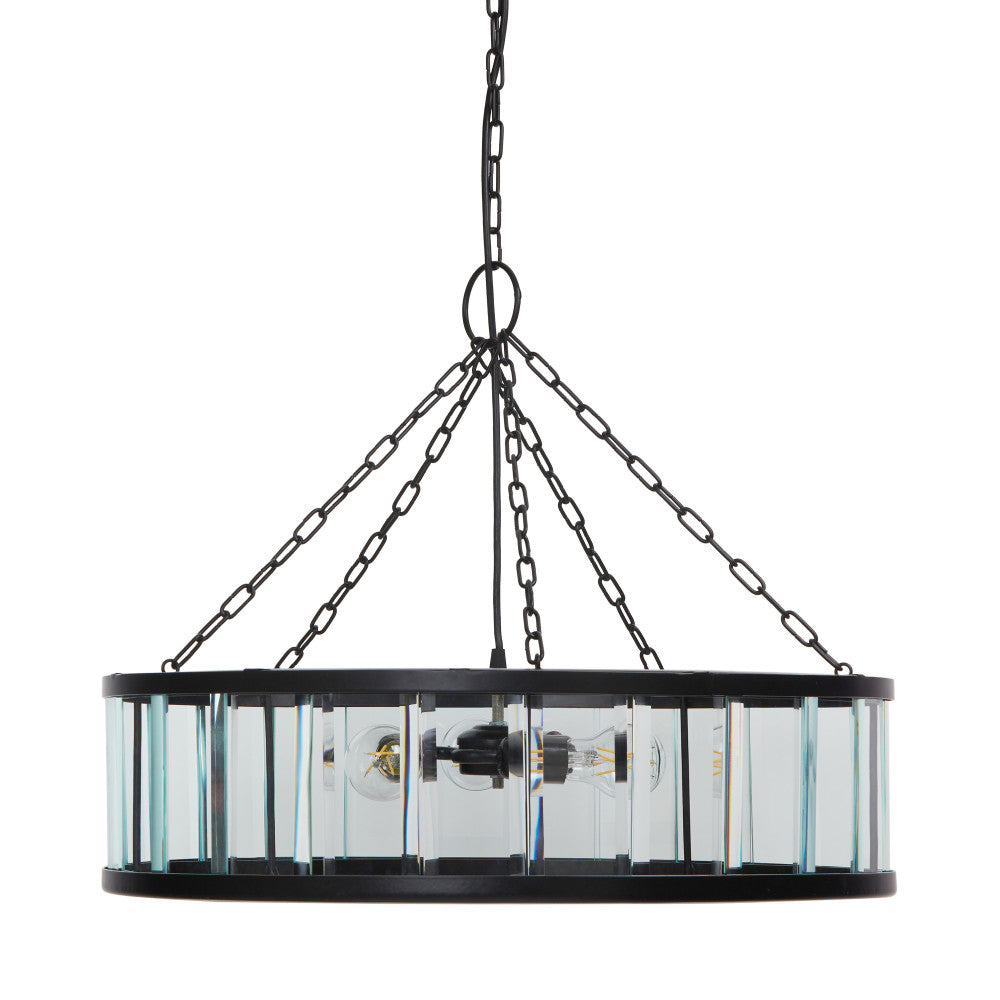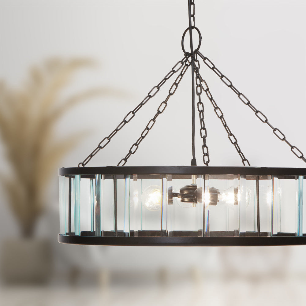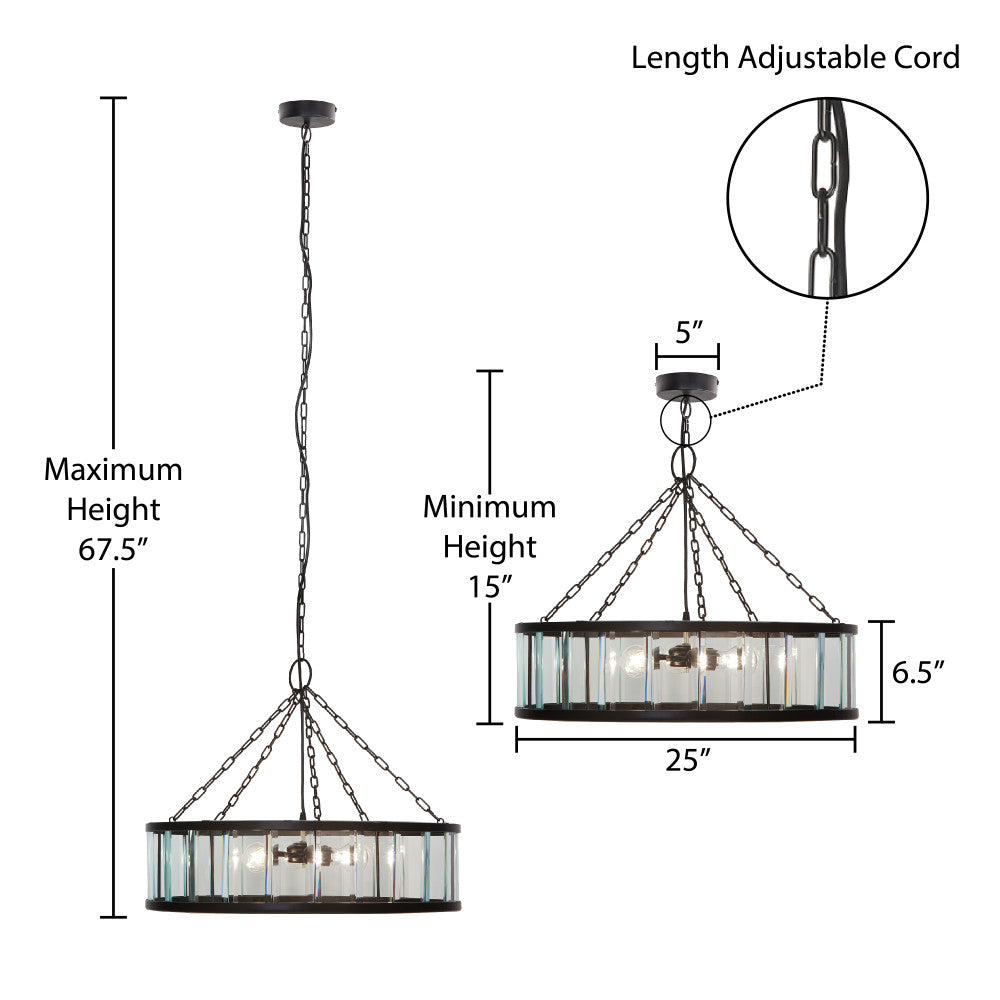 Add breathtaking lighting to your dining room or foyer with this chandelier-like hanging pendant light. With a black-finish round metal canopy and a clear beveled glass drum shade with a black metal frame, it makes a great pairing with glam or modern decor. The pendant casts a warm glow with three 40-watt Type A bulbs (not included). Plus, the adjustable hanging cord lets you set the drop height anywhere between 15 and 67.5 inches to best fit your space.
