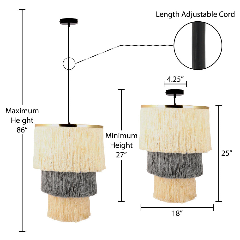 Elevate your space with this stunning pendant light. A blend of dark and soft hues, this light features a bohemian and eclectic style that blends well with your room's existing design. The drum shade is crafted from grey and cream fringe hanging from a brass accent ring, creating a warm, multi-directional glow. The hanging height of this fixture is adjustable from 27-in to 86-in, allowing you to customize the light according to your needs. This light is compatible with incandescent, CFL, and LED bulbs (not included), giving you flexibility in your lighting choices.