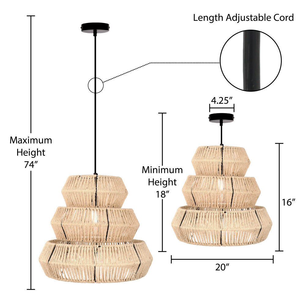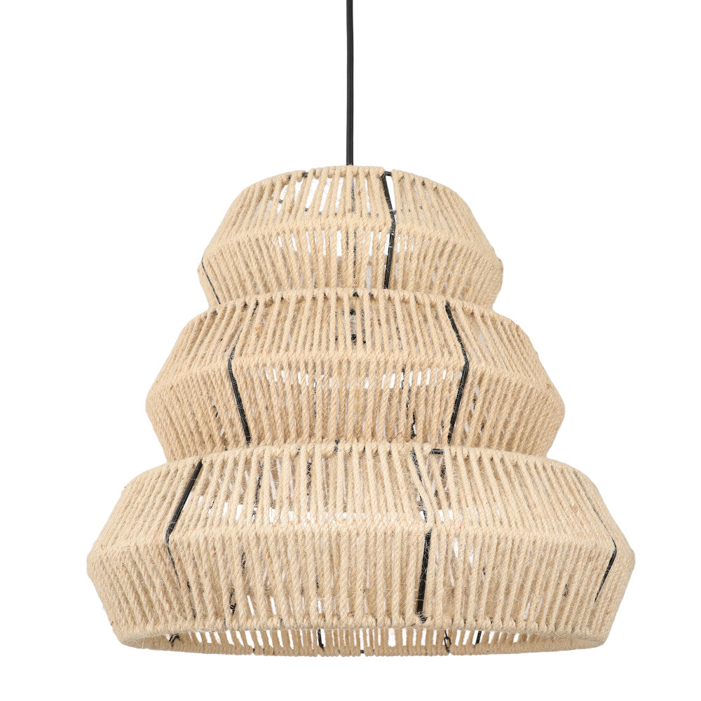 Bring bohemian charm into your living space with this Ophelia pendant light. This 3-tier pendant lamp is handcrafted from iron wire and cream jute thread, giving it a unique texture and design. The fixture's cream and black color scheme adds a subtle, elegant touch that complements a variety of home decor styles. The height of the pendant is adjustable, making it versatile enough to fit in rooms of different sizes and ceiling heights. The multi-directional light ensures a warm ambience, adding to its aesthetic appeal.