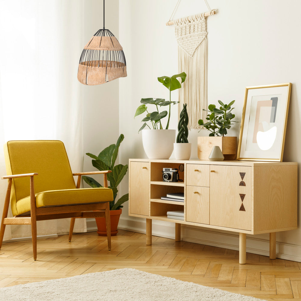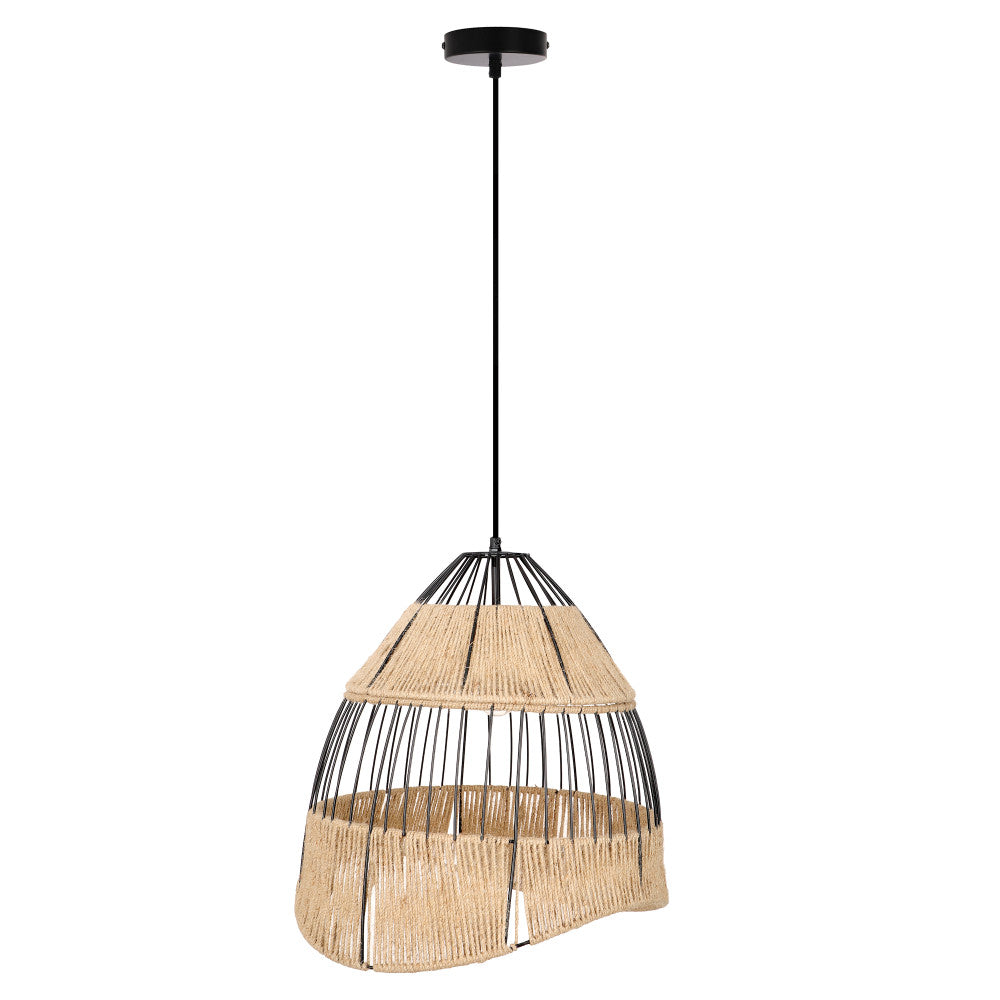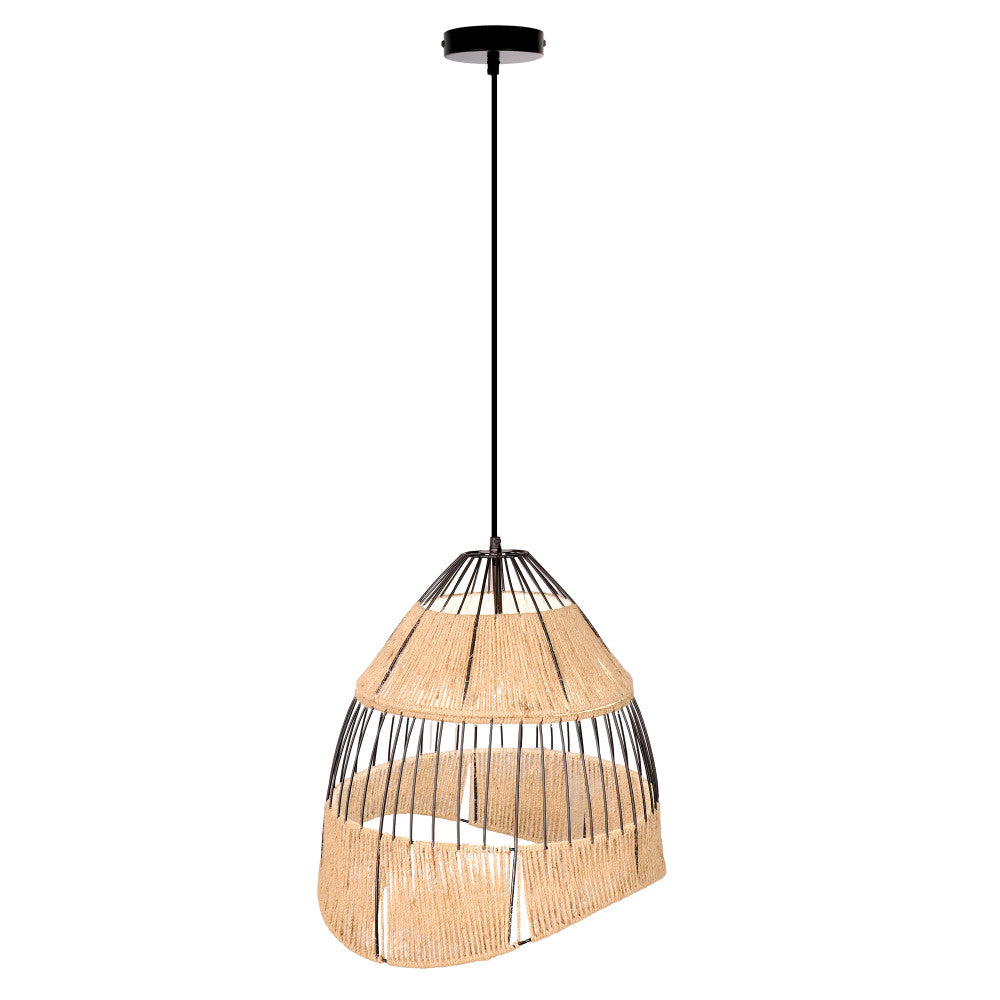 Bohemian-style pendant light with asymmetrical dome-shaped metal and jute shade