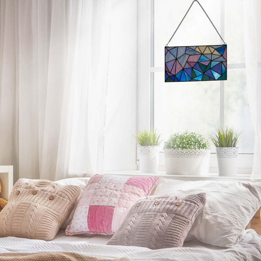 This cool abstract stained glass window panel offers a beautifully handcrafted piece of art for any sunny spot in your home. This decorative stained glass panel is perfect for use as a suncatcher or wall art, with the colors of the glass becoming more vibrant when light passes through. The rectangular panel features a geometric design and is crafted from 52 individual glass cuts using traditional hand-soldering methods to create a one-of-a-kind design. Plus, it comes with a 24-inch chain for quick and easy hanging.