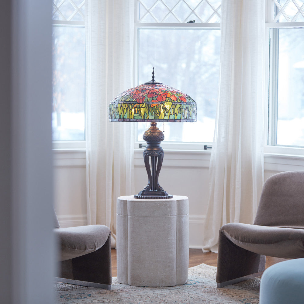 Add a gorgeous, traditional look and warm lighting to your bedside or console table with this Tiffany-inspired table lamp. Based on an original Louis Comfort Tiffany design, this lamp features an antique-bronze finish polyresin novelty base and a stained glass dome shade. Made using 1047 individual glass cuts, the shade depicts a field of tulips in red and green hues against a blue backdrop, which will add vibrant color to the light from 3 60-watt Type A bulbs (not included). Three pull chain switches offer easy operation, and the 60-inch power cord is a perfect length for placement on a desk, nightstand or end table.