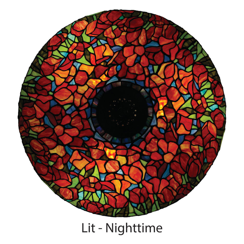 Shade made from 1,047 individual glass cuts depicts field of tulips against a blue backdrop