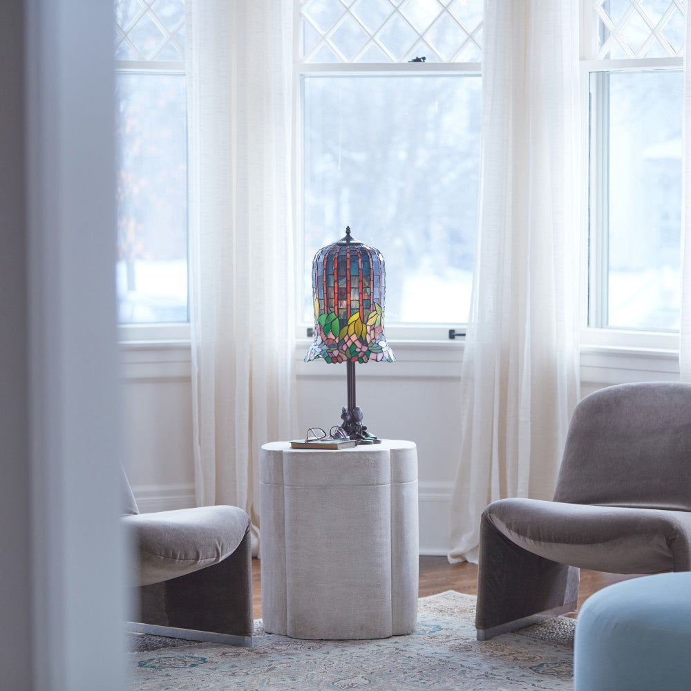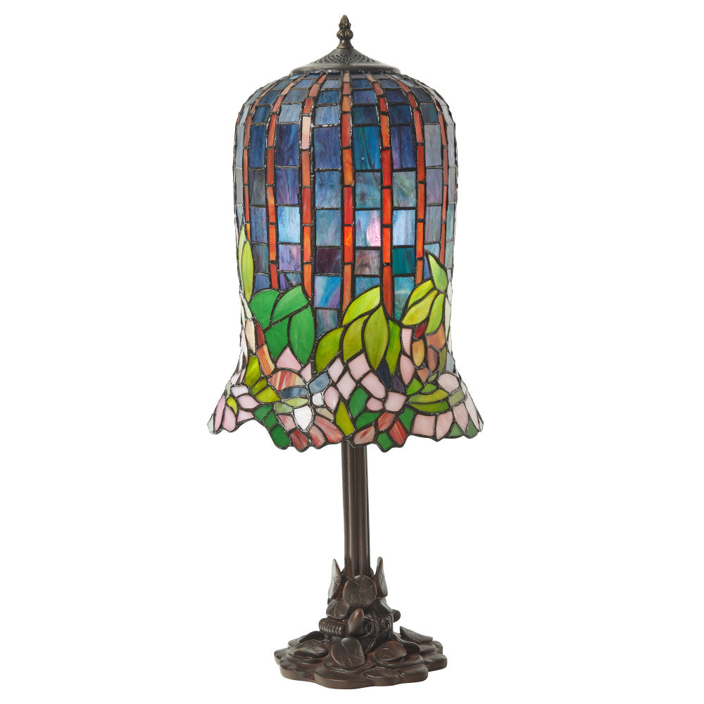 You'll love adding this uniquely elegant Tiffany-style table lamp to a side or console table in any room. Inspired by an original Louis Comfort Tiffany design, the lamp showcases an antique bronze-finish metal novelty base and a stained glass bell shade made from 508 individual glass cuts. The shade depicts pond lilies, branches and leaves in green, pink and blue against a deep blue sky, adding vibrant colors to the light from one 60-watt Type A bulb (not included). Best of all, the 96-inch power cord with an in-line switch offers easy placement and operation.