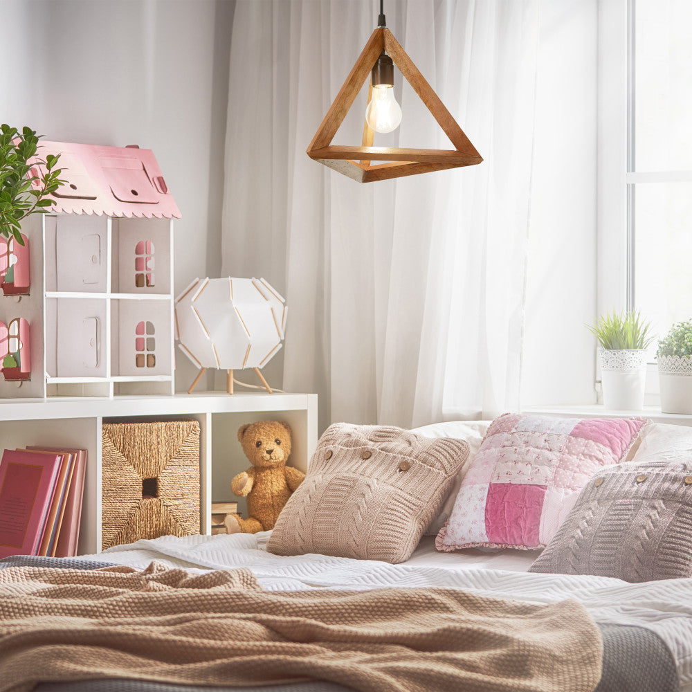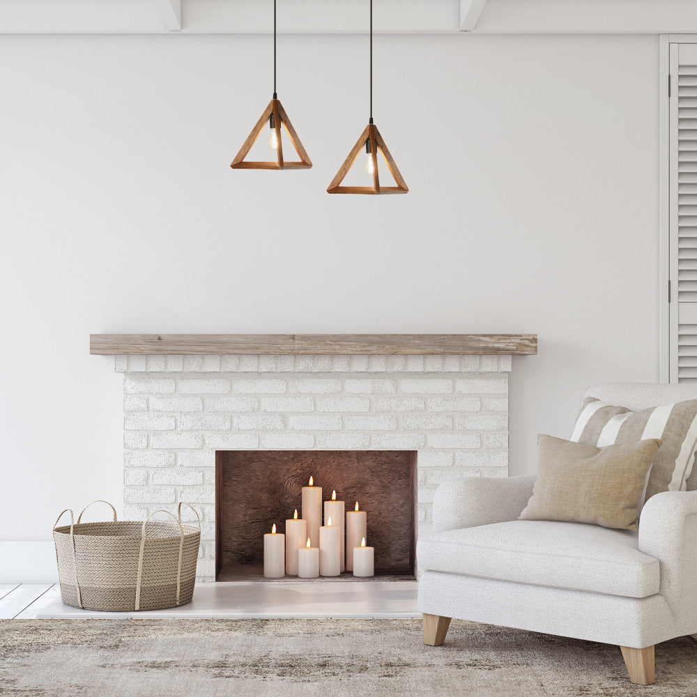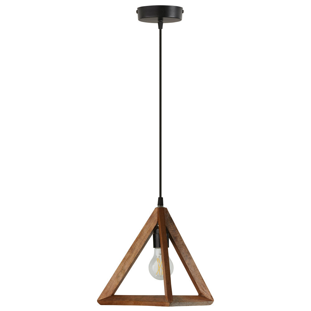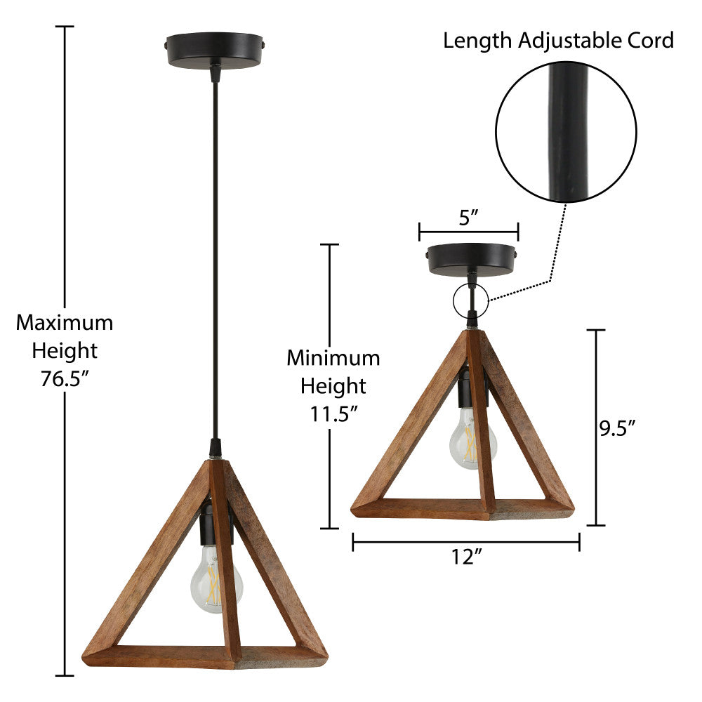 This unique hanging pendant light brings rustic style and soft lighting to any room in your home. Featuring a black-finish round metal canopy and a brown mango wood triangular shade with an open design, it pairs excellently with modern, industrial or cabin-style decor. The pendant hardwires into the ceiling, and thanks to the adjustable hanging cord, you can set the drop height between 11.5 and 76.5 inches to best fit different spaces. It requires one 40-watt Type A bulb (not included).
