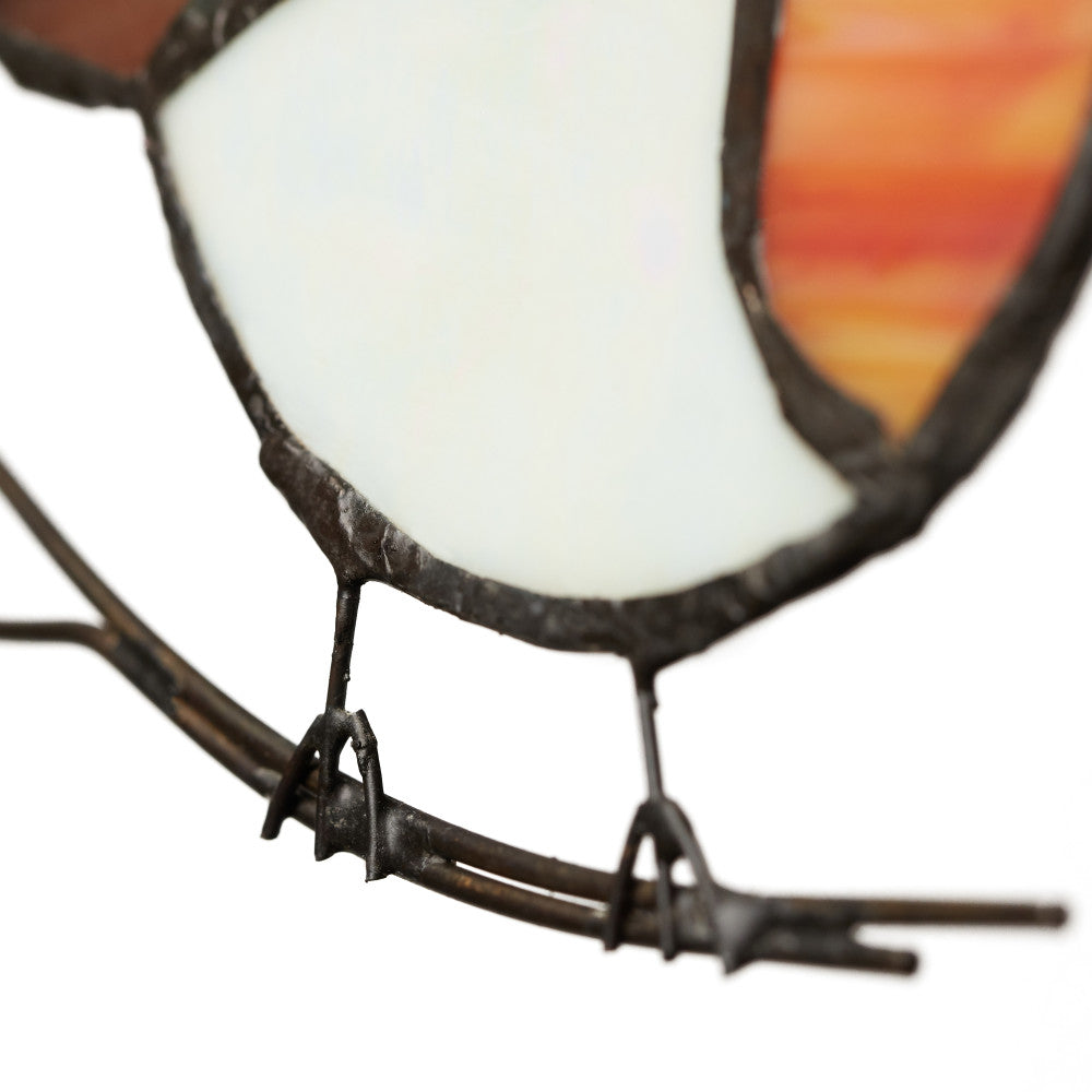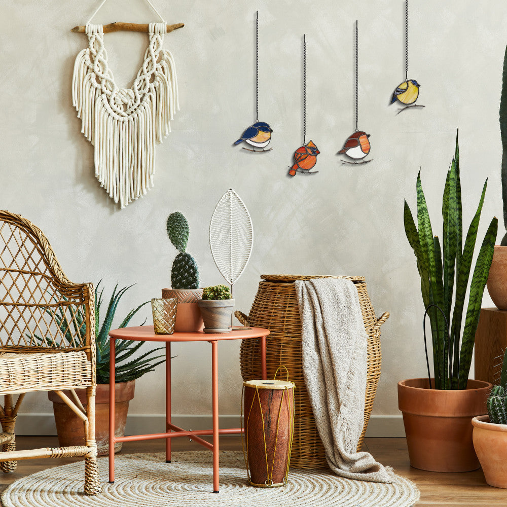 This adorable stained glass accent for a window or a wall blends well with Bohemian, shabby chic or cabin-style decor. The unique window panel set features four small songbirds, including a cardinal, bluebird, robin and a goldfinch, and each has its own 11.75-inch hanging chain. Crafted with traditional artisan glass making and soldering methods and made up of 33 individual glass cuts in red, blue, yellow and brown hues, you can hang these birds in any sunny window to fill the space with an array of colorful light.