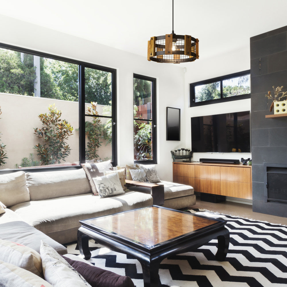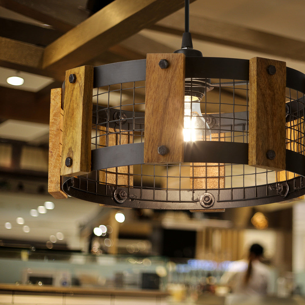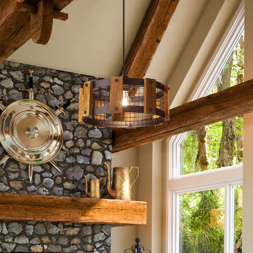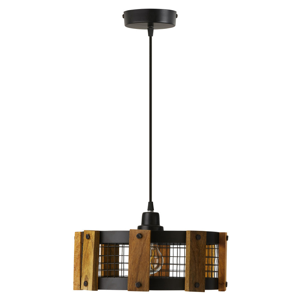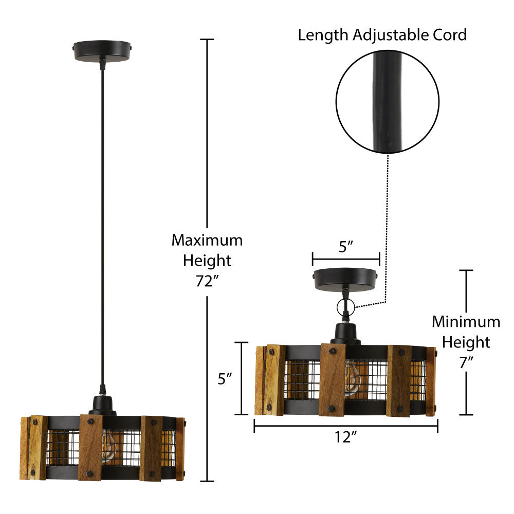 You'll enjoy all of the compliments you'll receive with this mission-inspired, height-adjustable pendant lamp hanging in your dining room, family room, or above your kitchen island. The black painted metal circular fixture hardwires directly into your ceiling, allowing the drum-shaped wood and metal shade to suspend anywhere from 7 to 72 inches. The glass-free wood shade in a natural color with metal cage detailing complements a range of decor styles by bringing a cool, modern vibe with the cage detailing allows the glow of a single 40-watt bulb (not included) to shine through.