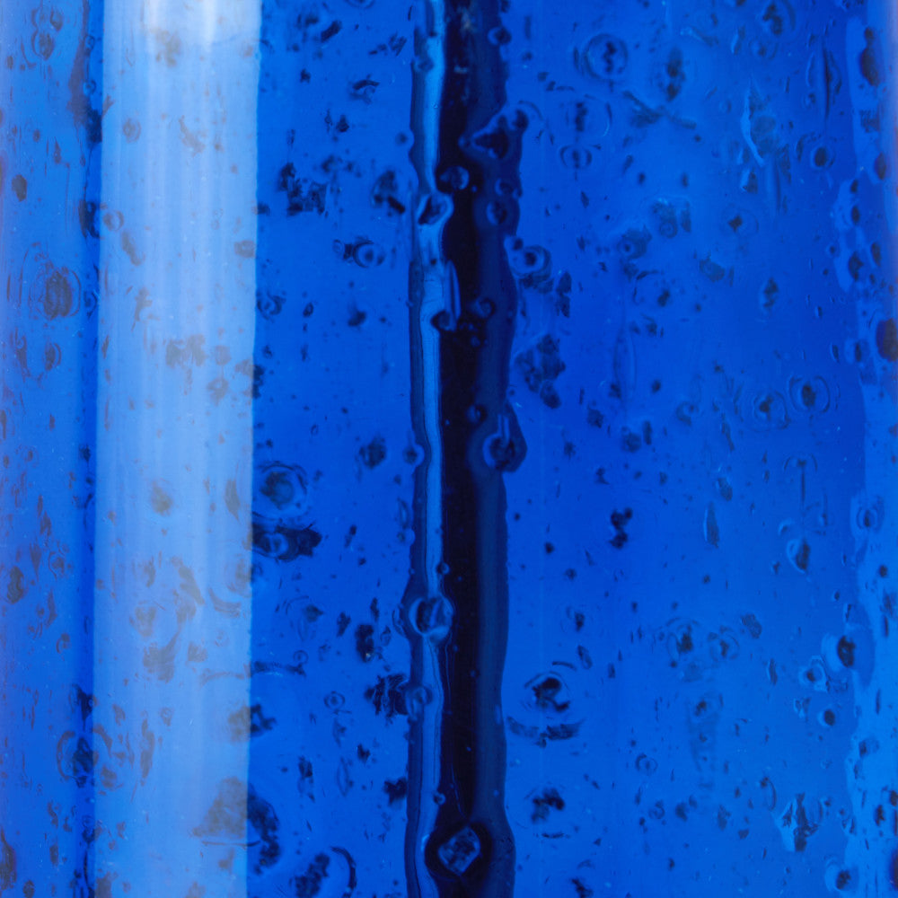 Base made from brass-tone metal and textured blue glass; beige fabric shade