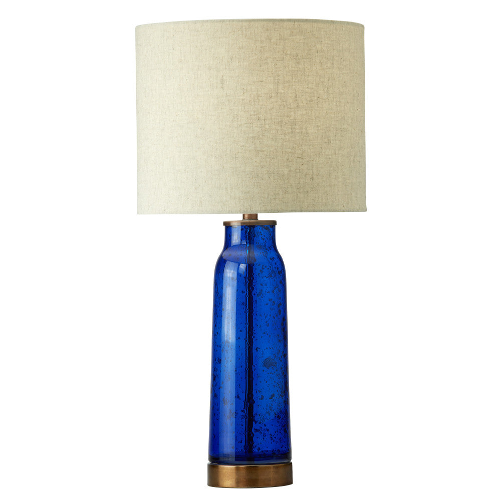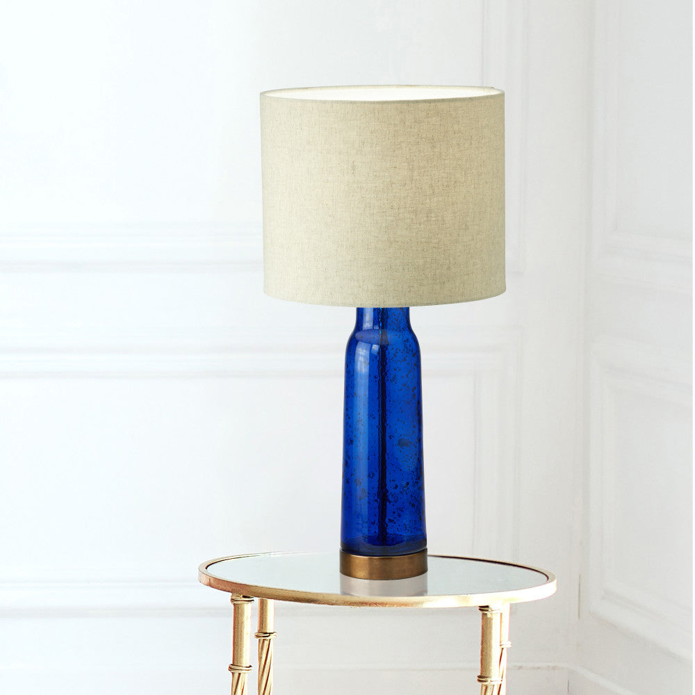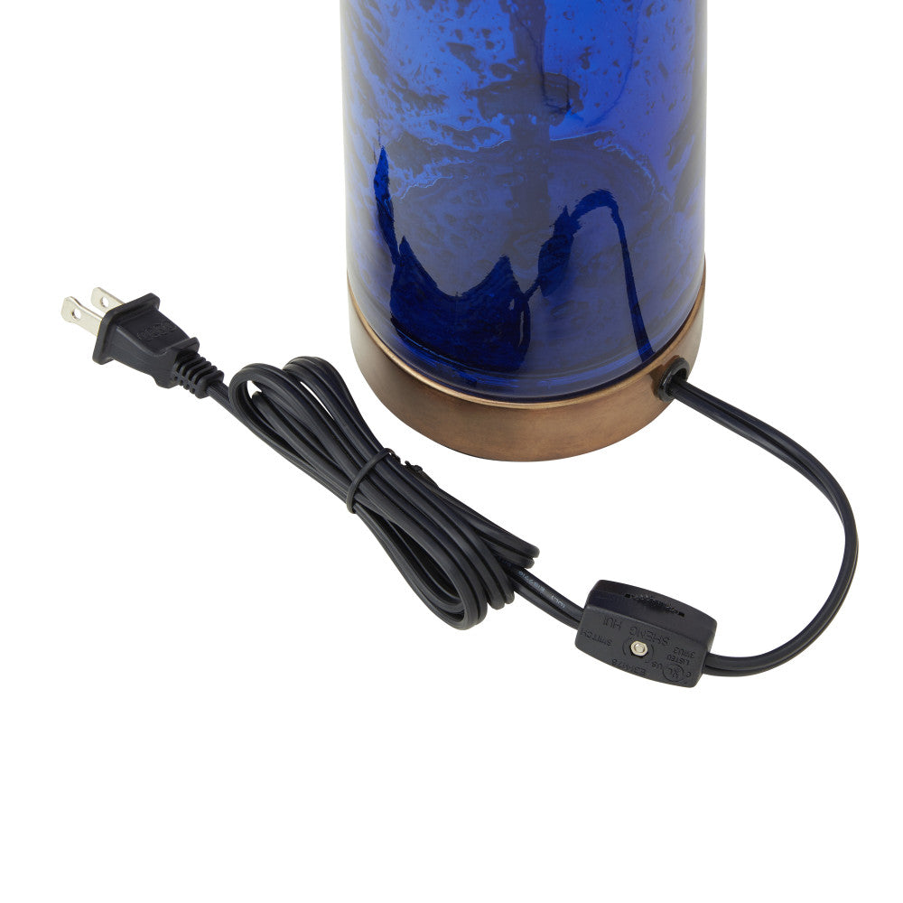 Give the lighting in your living room, bedroom or foyer a stylish update with this mixed-material table lamp. A perfect addition to glam or modern decor, this lamp showcases a cylinder base made from blue textured glass with a brass-tone metal piece in the center supporting the beige fabric drum shade. This lamp lights up with one 60-watt Type A bulb (not included) and thanks to the 65-inch power cord with an in-line switch, it can easily be placed on any side, console or bedside table.