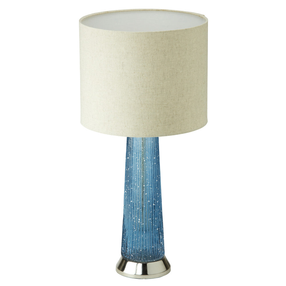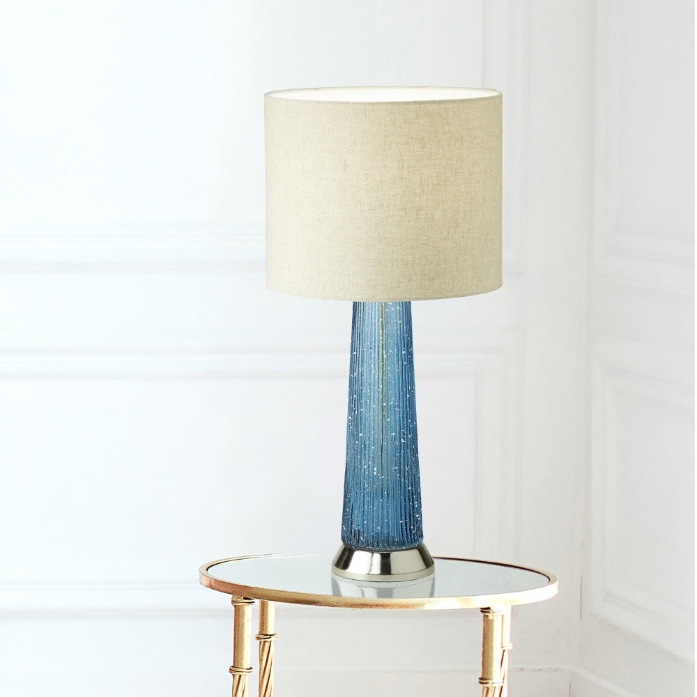 Give the lighting in your living room, bedroom or foyer a stylish update with this mixed-material table lamp. A perfect addition to glam or modern decor, this lamp showcases a cylinder base made from blue ribbed-textured glass with a gold-tone metal piece in the center supporting the beige fabric drum shade. It lights up with one 60-watt Type A bulb (not included) and thanks to the 65-inch power cord with an in-line switch, it can easily be placed on any side, console or bedside table.