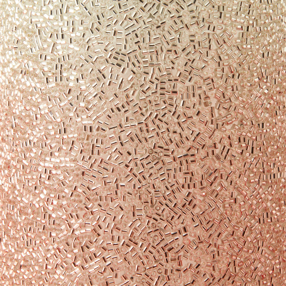 Base made from gold-tone metal and pink/silver ombre beaded glass with an eggshell white fabric shade