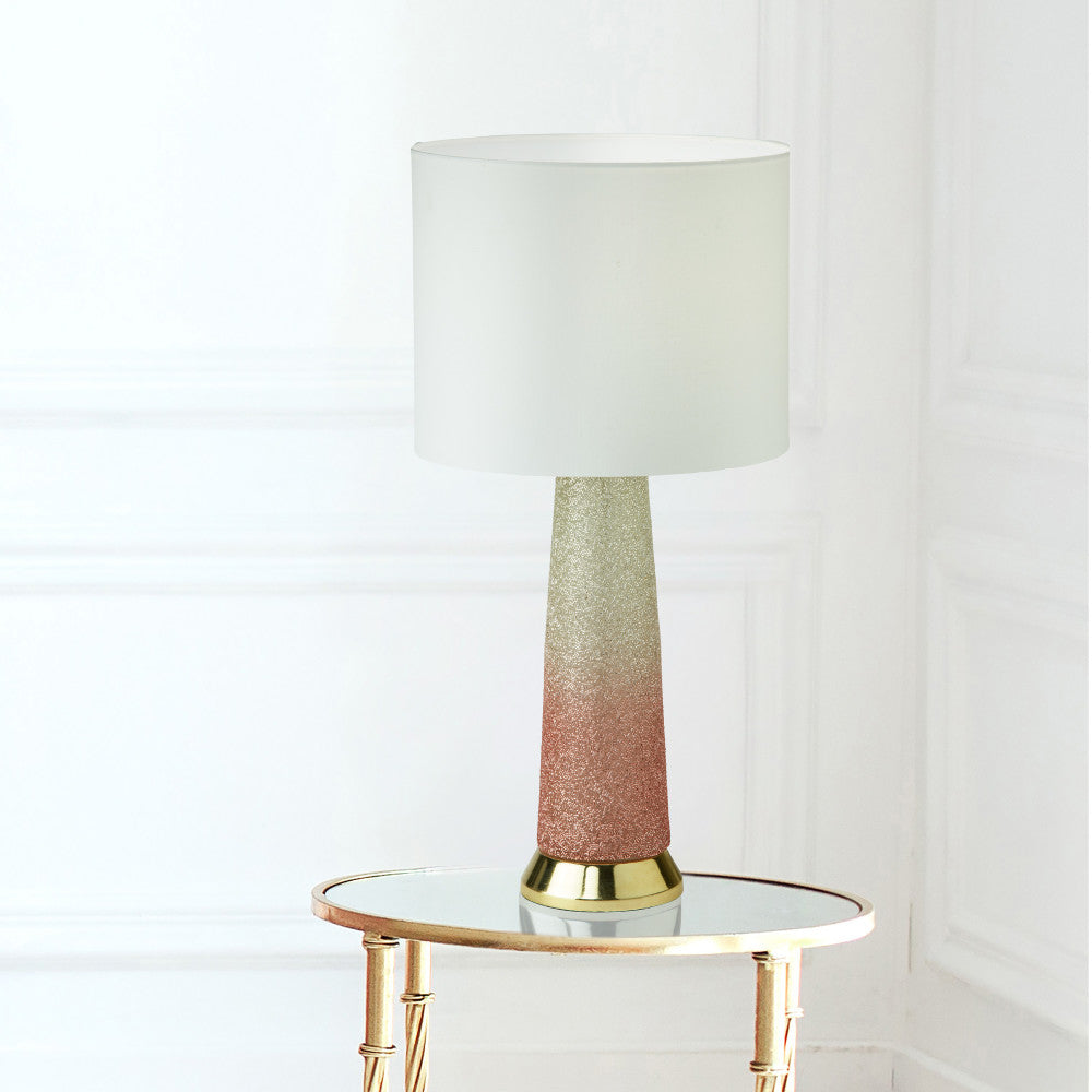 Give the lighting in your living room, bedroom or foyer a stylish update with this mixed-material table lamp. A perfect addition to glam or modern decor, this lamp showcases a cylinder base made from pink/silver ombre beaded glass with a gold-tone metal piece in the center supporting the eggshell white fabric drum shade. This lamp lights up with one 60-watt Type A bulb (not included) and thanks to the 65-inch power cord with an in-line switch, it can easily be placed on any side, console or bedside table.