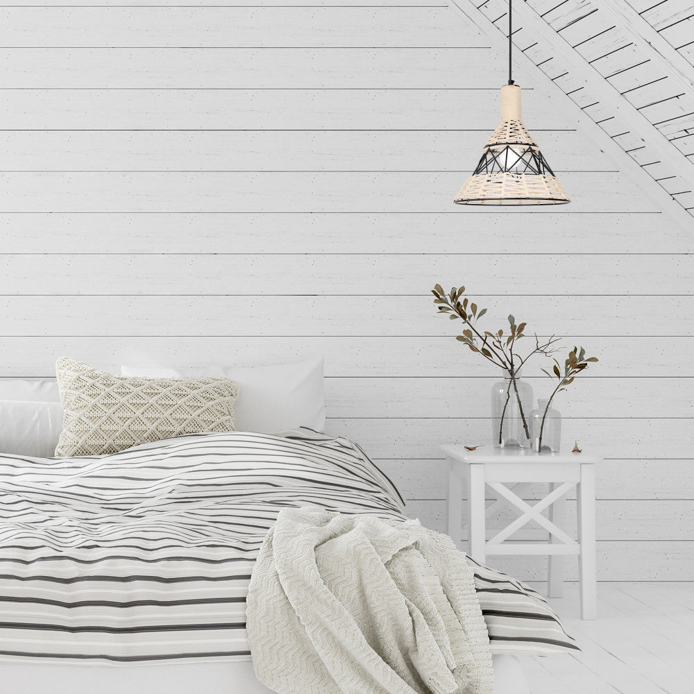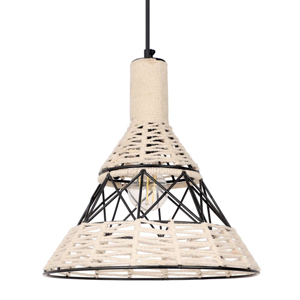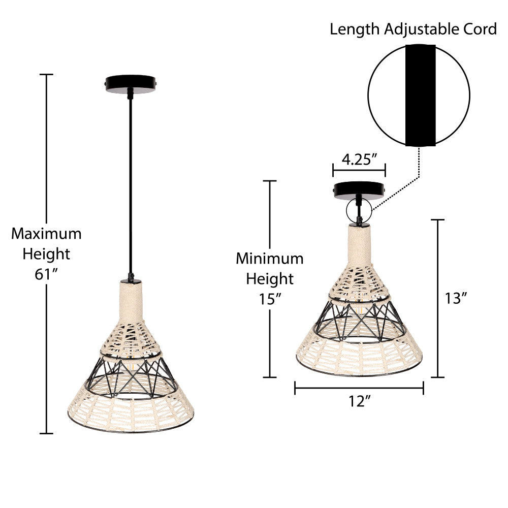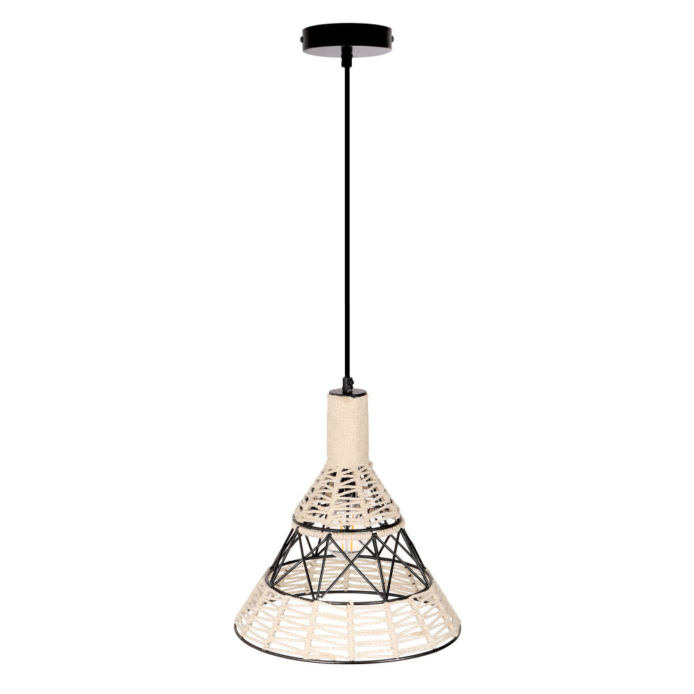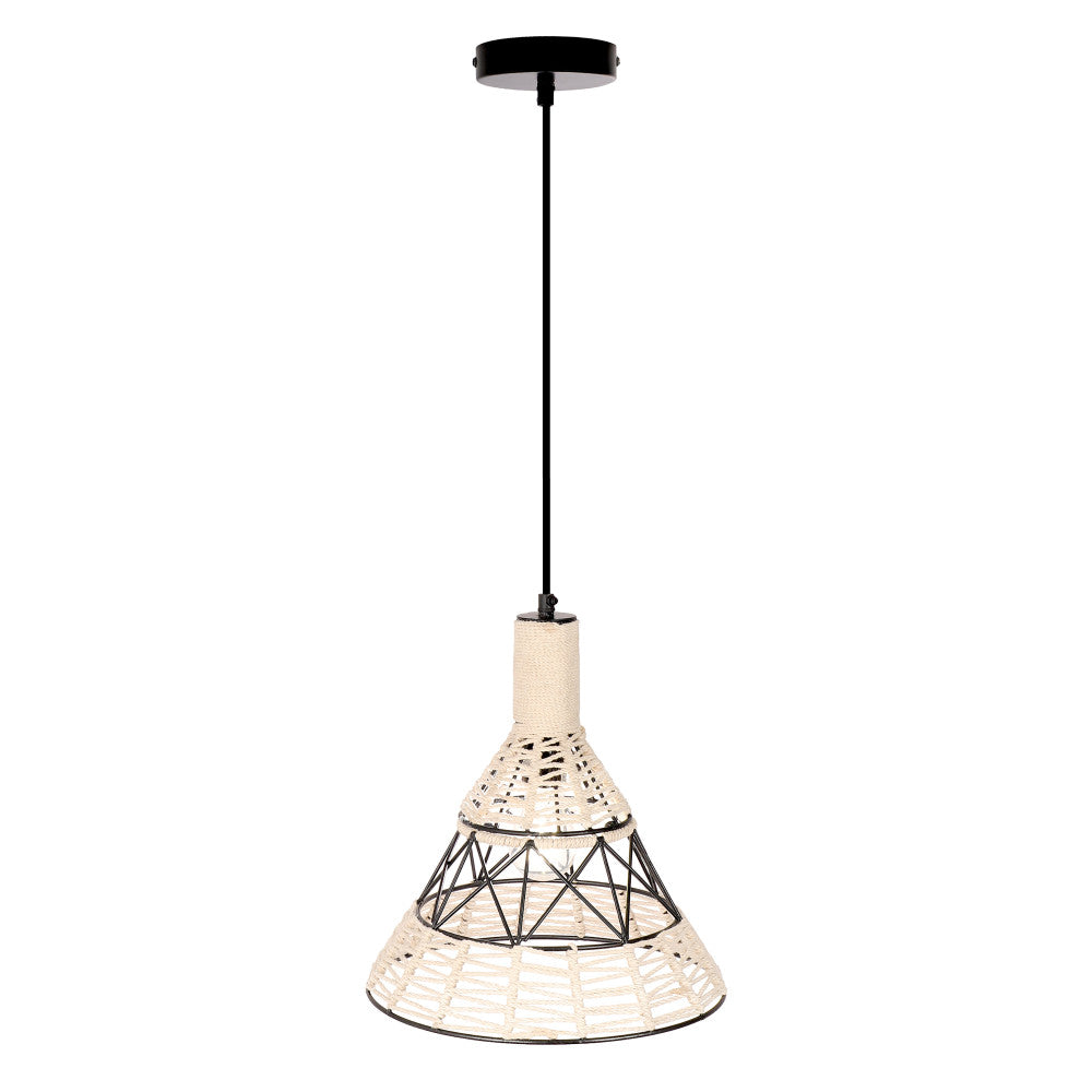 Introduce a bohemian touch to your space with this pendant light, meticulously handcrafted with a black metal canopy and a white cone-shaped shade made of woven fabric. This pendant exudes a downlight illumination, casting a beautiful warm glow in your room. Its height is adjustable, allowing you to customize the drop length to suit your preference. A perfect accent piece for your living room, dining area, or bedroom.