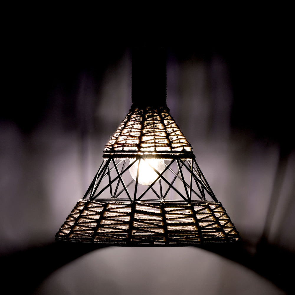 Black metal canopy and white cone-shaped fabric shade in a woven design