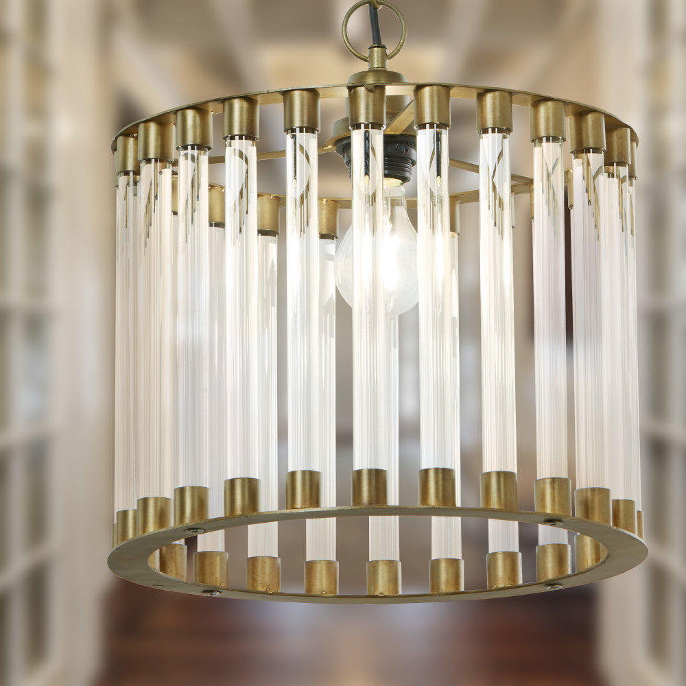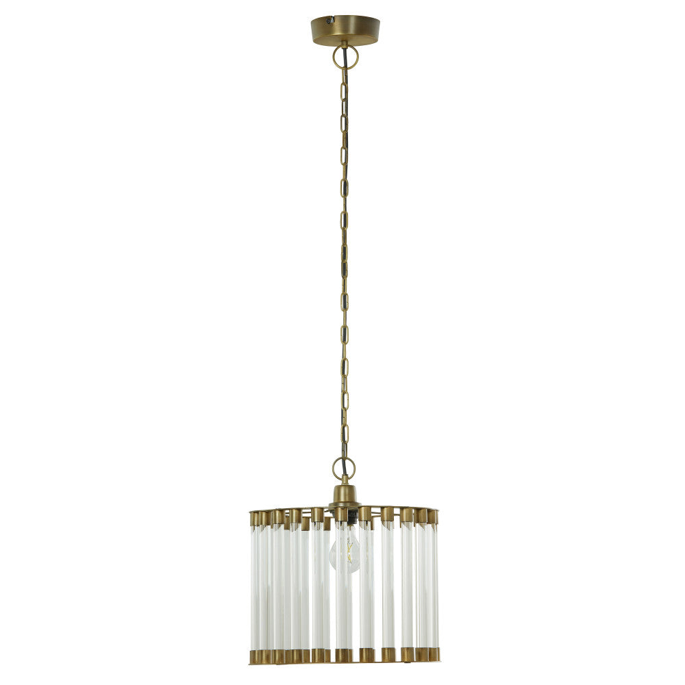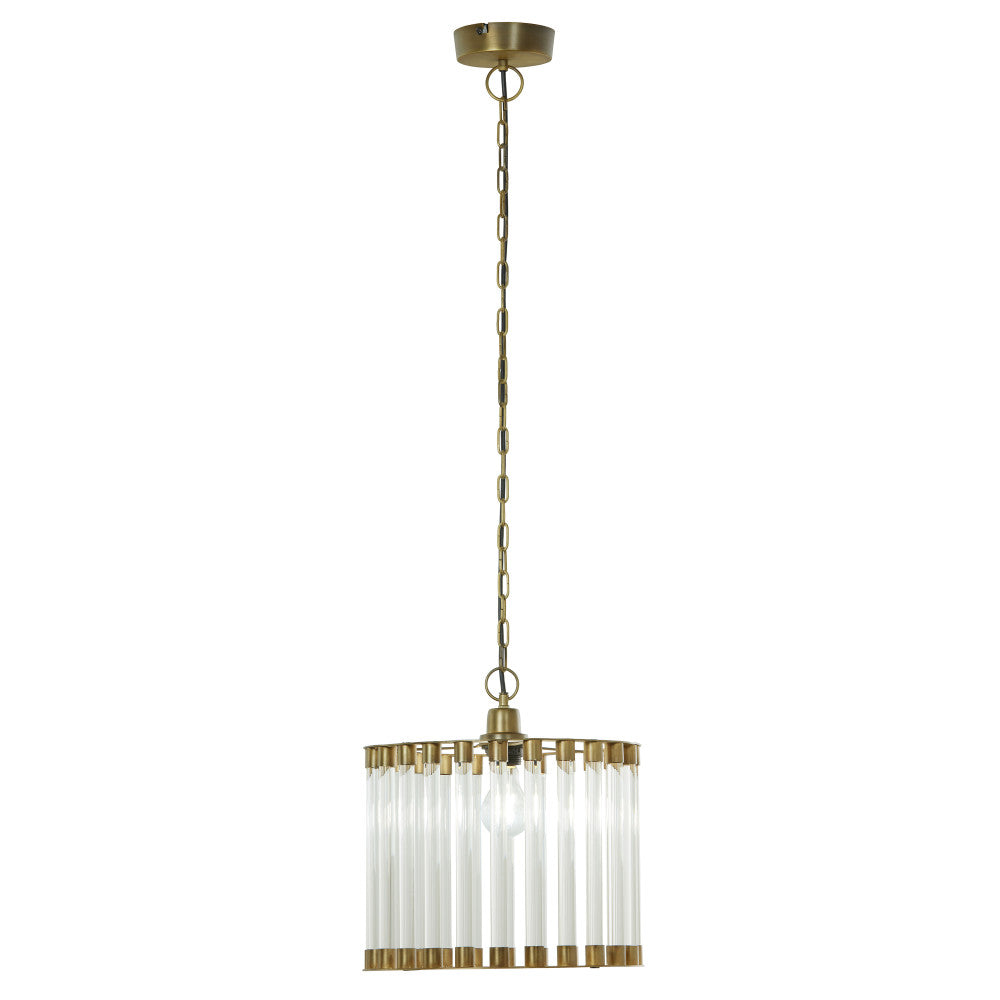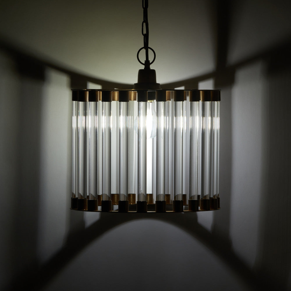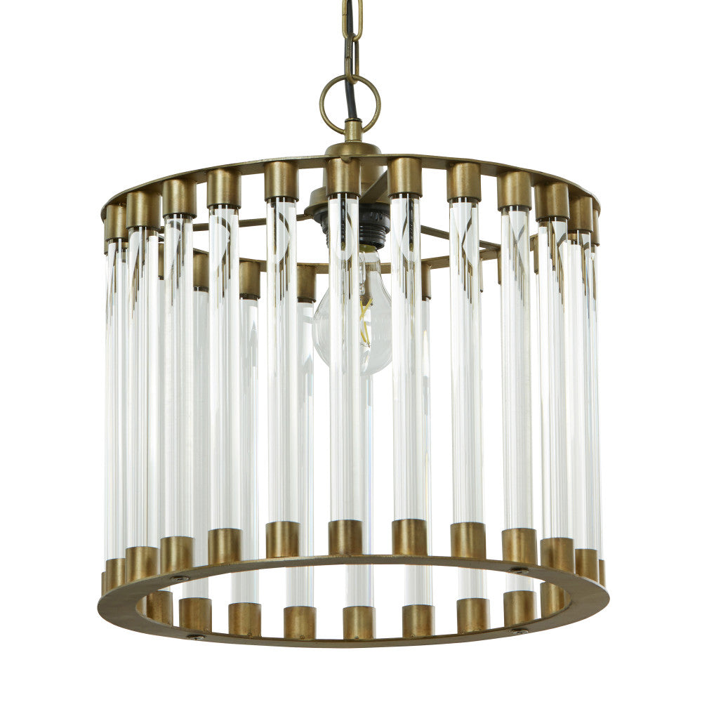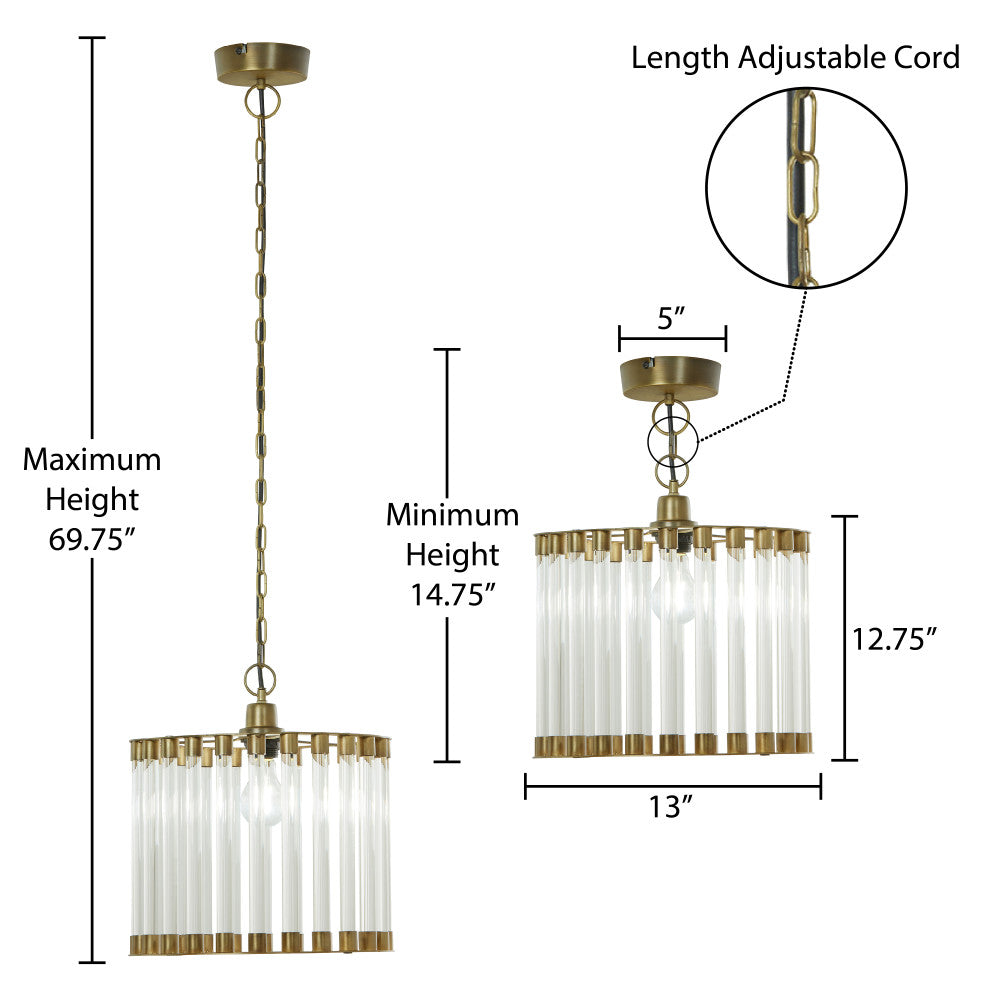 This hanging pendant light is a beautiful option for revamping your interior lighting. Showcasing a gold-finish metal canopy and a stunning open drum shade made up of evenly spaced glass bars with a gold-finish metal frame, this pendant makes a great pairing with glam or modern decor. It casts a warm glow with the help of one 40-watt Type A bulb (not included). And thanks to the adjustable hanging cord, you can set the drop height between 14.75 and 69.75 inches.