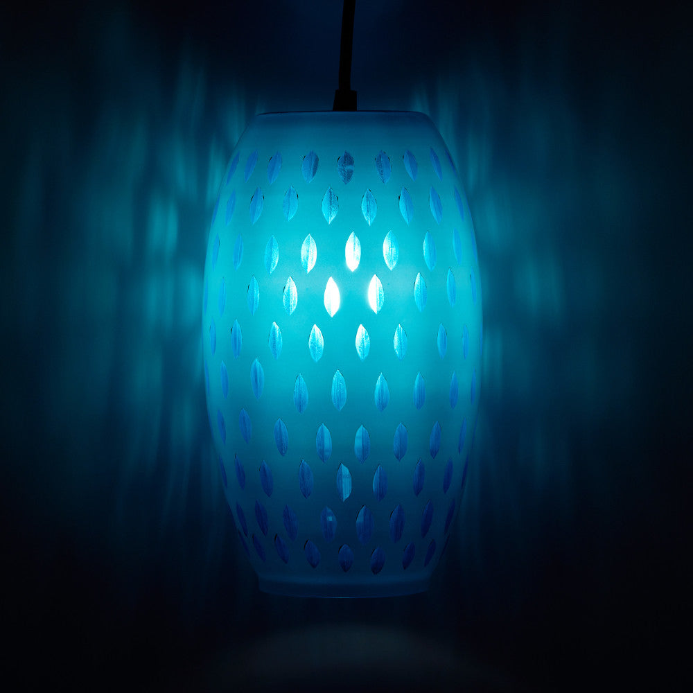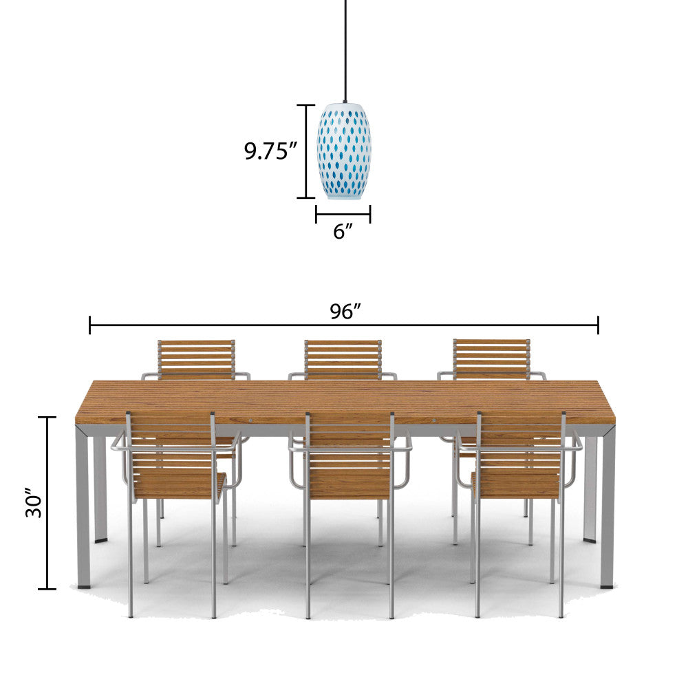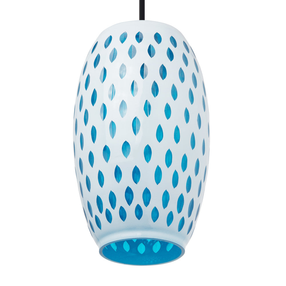 Show off your unique sense of style with this elegant pendant light. The combination of black metal and hand-blown glass in a white and blue toned globe shade adds a touch of charm and sophistication to your space. This pendant light features a painted canopy and a textured shade that casts a beautiful, soft downlight. The hand-cut diamond-like design reveals the blue blown glass through the white overlay. This fixture is ideal for any room where you desire a stylish and inviting atmosphere. The light requires one 25 watt bulb and is not included. Height is easily adjustable for your convenience, allowing you to customize the hanging length to suit your preference.