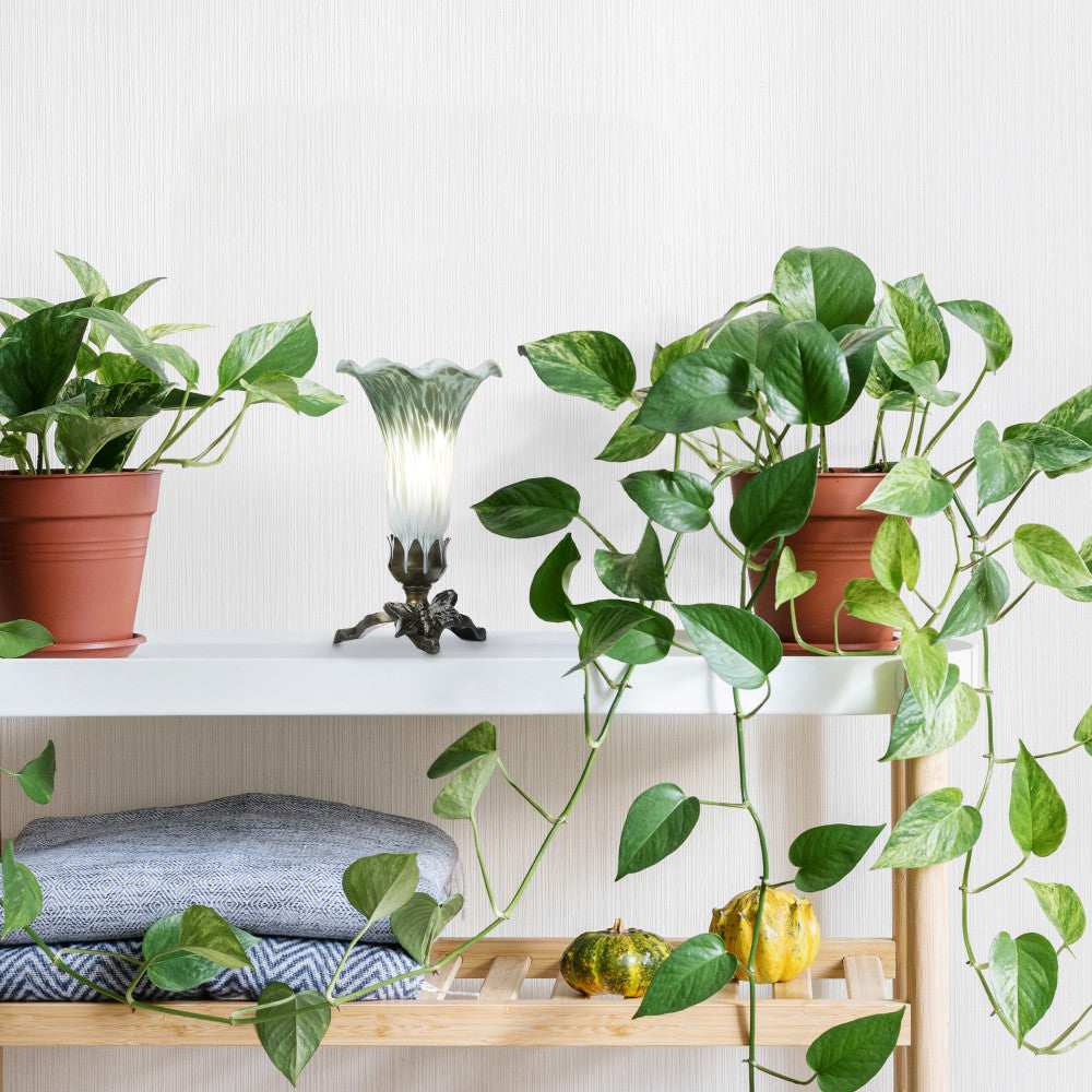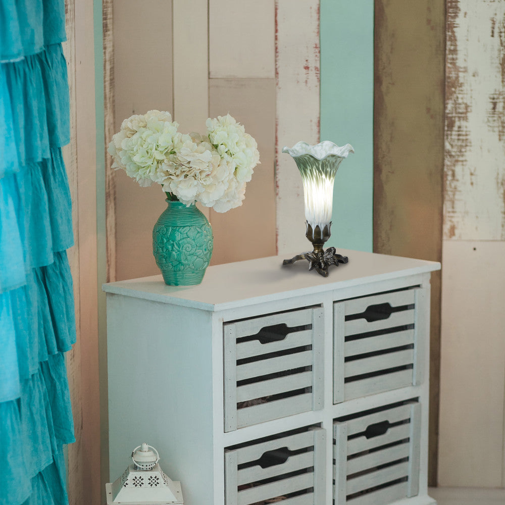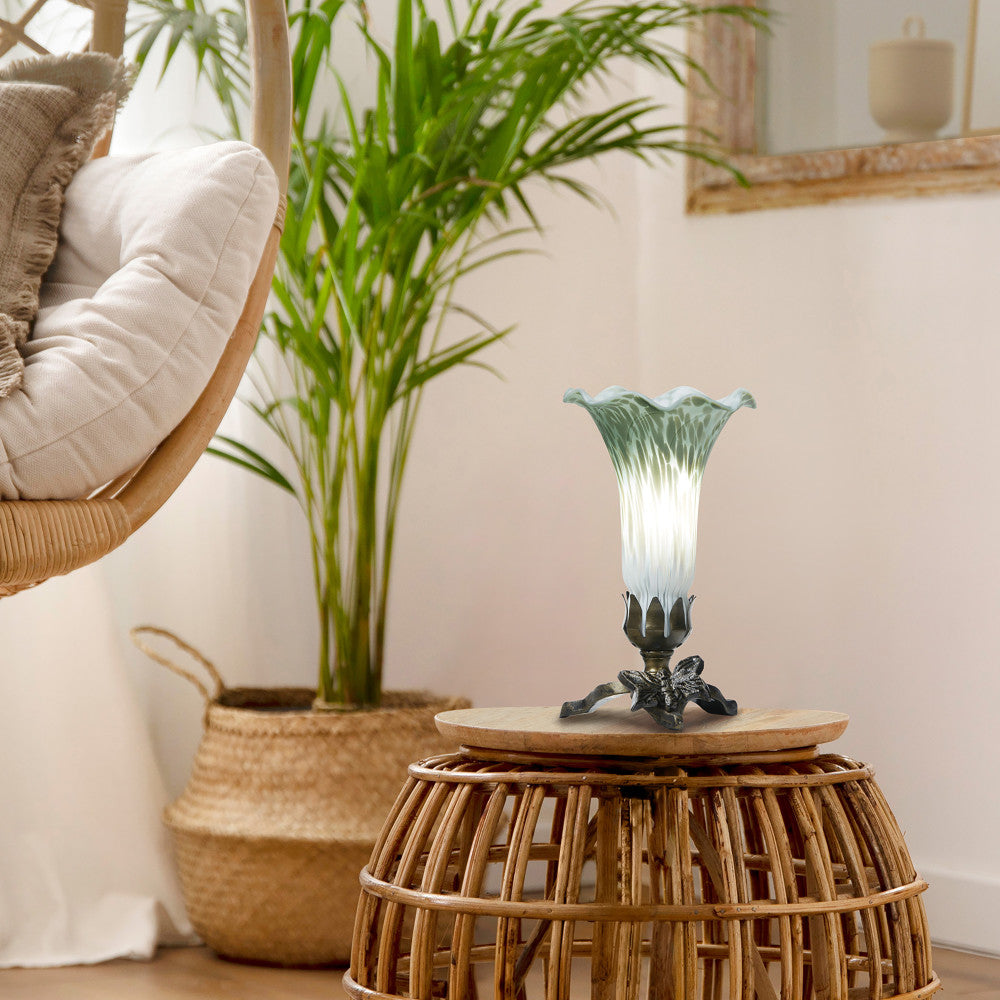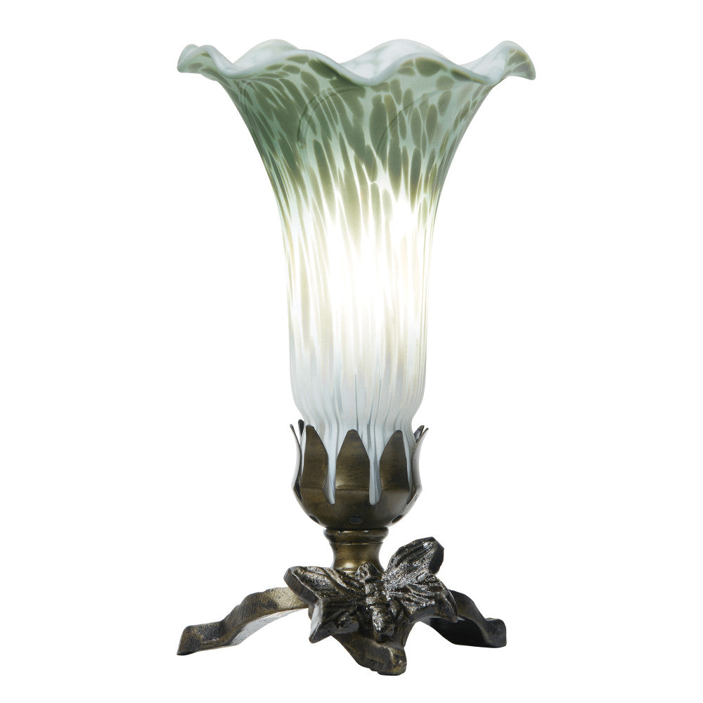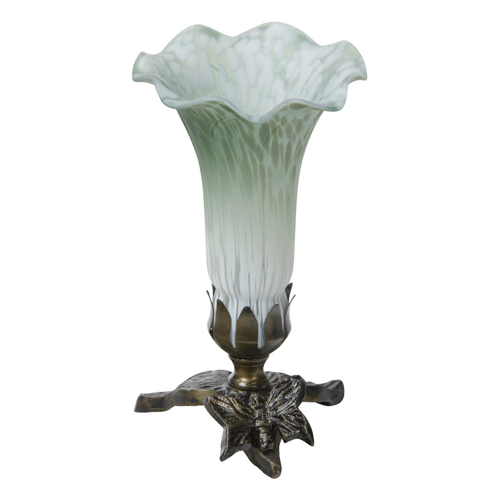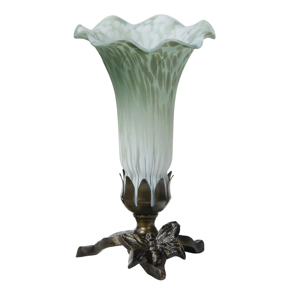 If you're an avid gardener or just love the look of flowers, this lily-shaped novelty accent lamp makes a perfect addition to your interior lighting. Made with an antique bronze-finish metal base and a green-and-white glass shade shaped like a lily flower, this lamp will give your space a warm, soft glow. It requires one 7-watt Type C bulb (not included), and the 66-inch power cord with an on-off line switch allows for versatile placement.