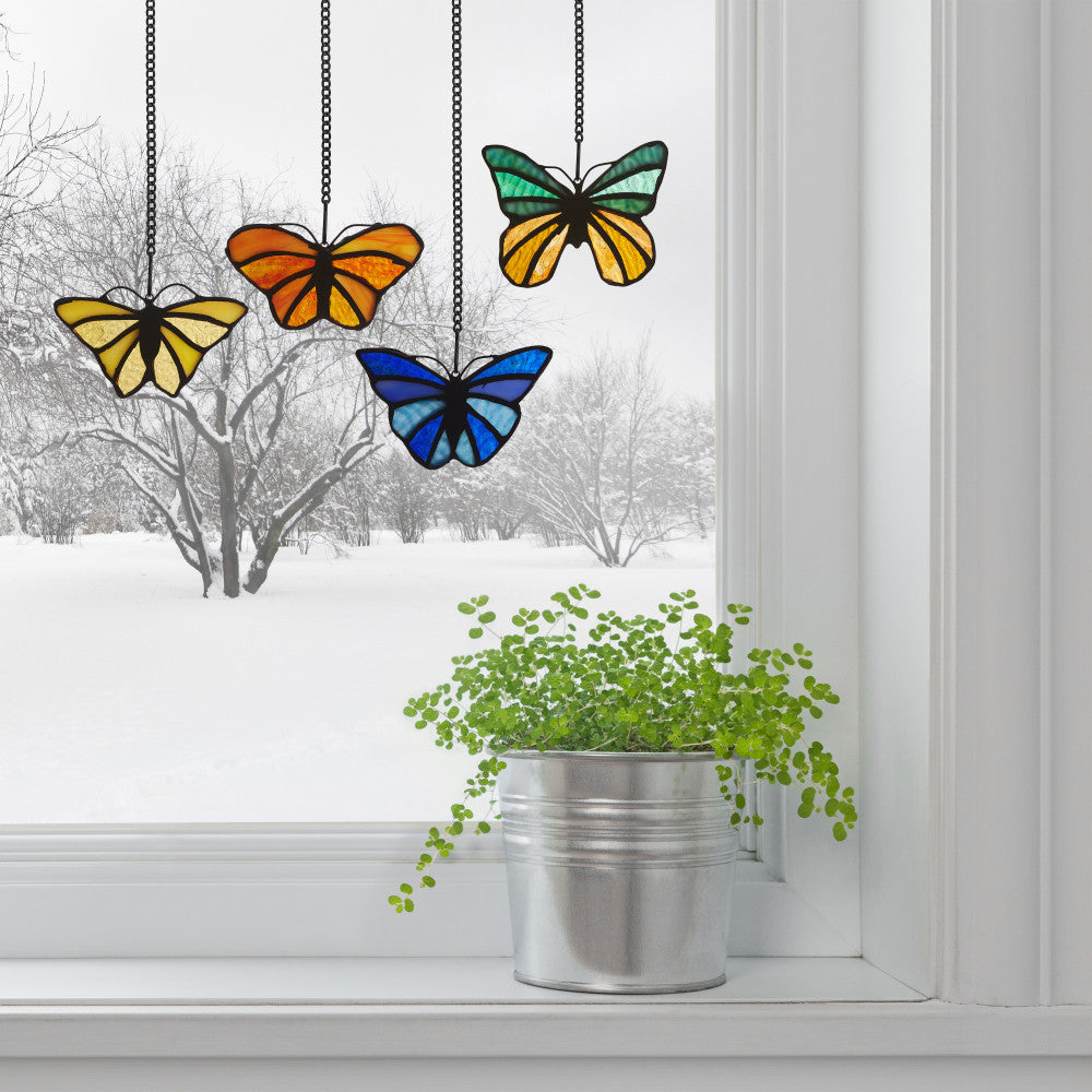 This adorable stained glass accent for a window or a wall blends well with Bohemian, shabby chic or cabin-style decor. The unique window panel set features four small butterflies, fluttering their colorful striated glass wings, and each has its own 11.5-inch hanging chain. Crafted with traditional artisan glass making and soldering methods and made up of 42 individual glass cuts in blue, green, yellow and orange shades, you can hang these butterflies in any sunny window to fill the space with an array of colorful light.