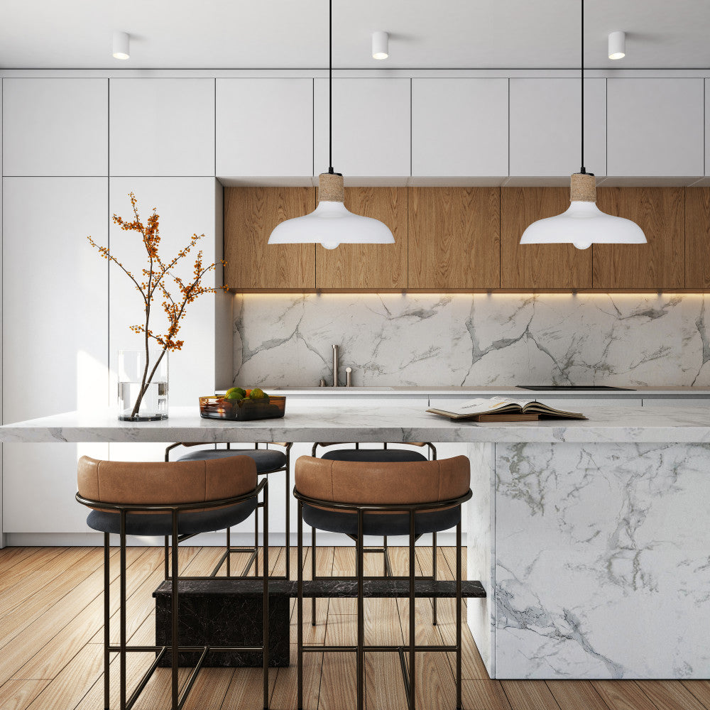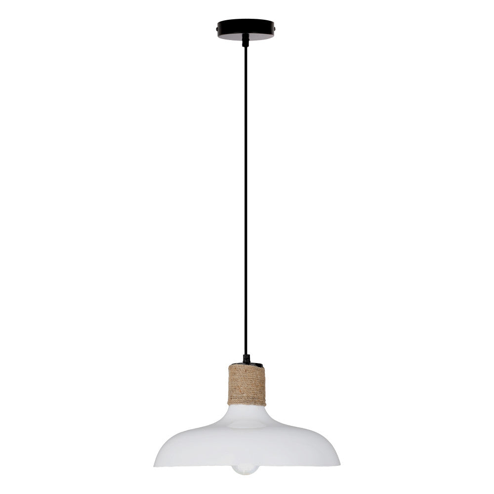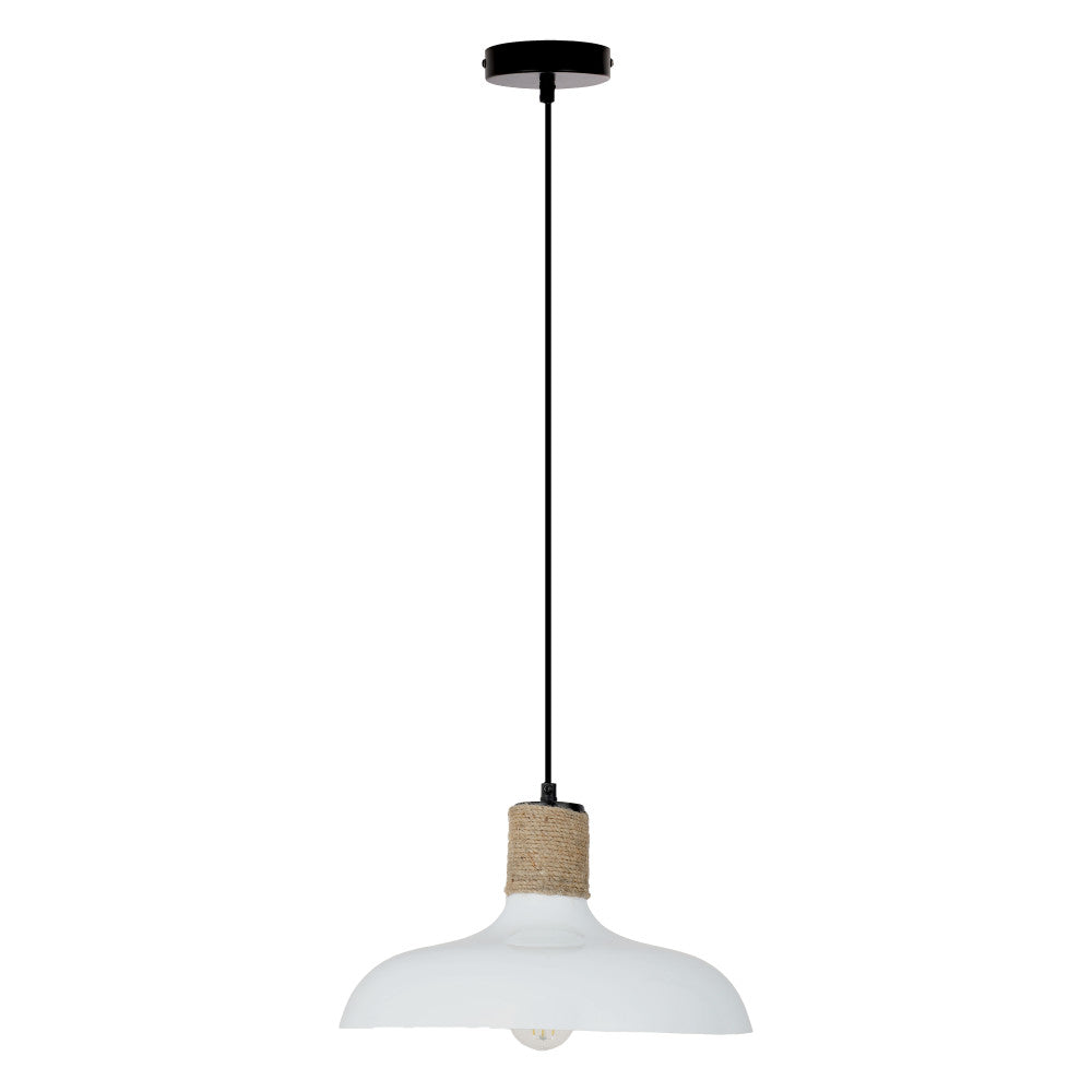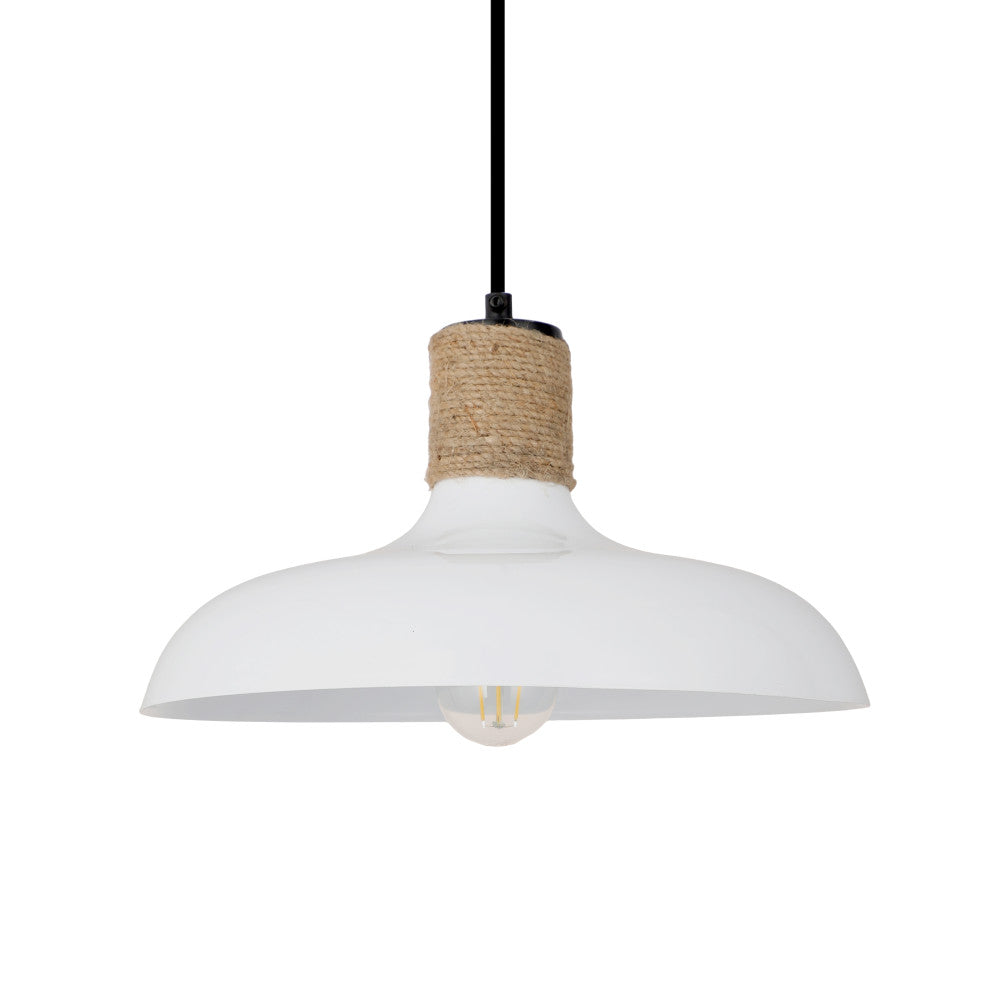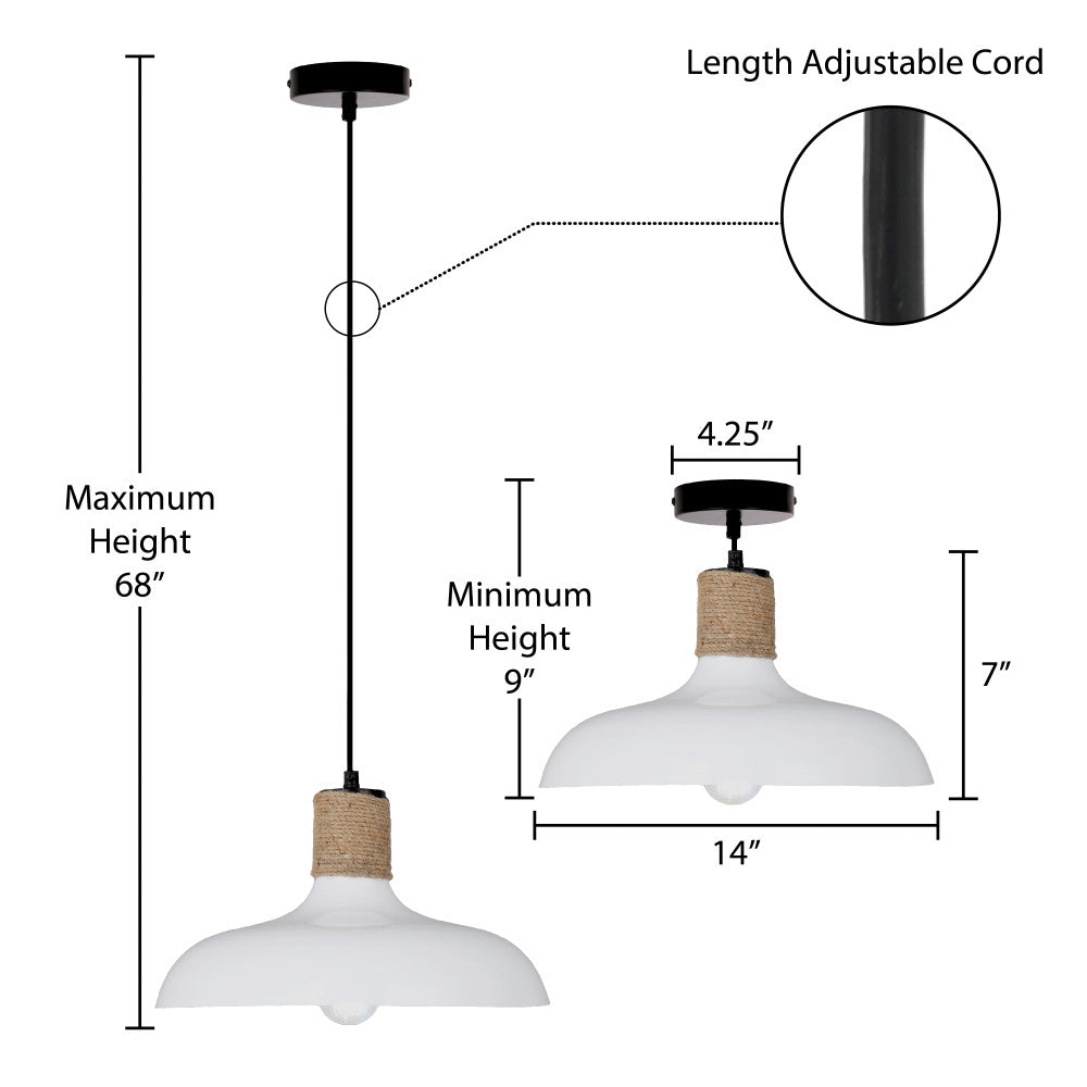 Featuring an adjustable height that ranges from 9 to 68 inches, this pendant is versatile enough to fit into any space. The pendant light shines a downward light, making it a great option for task lighting needs. The fixture features a black finish canopy with a dome-shaped shade made from painted white metal and natural jute, offering both sturdiness and style. The combination of white, jute, and the black finish canopy makes this piece a perfect addition to modern, transitional, or industrial styled spaces. This pendant light uses a Type A bulb (not included) and is compatible with incandescent, CFL, or LED.