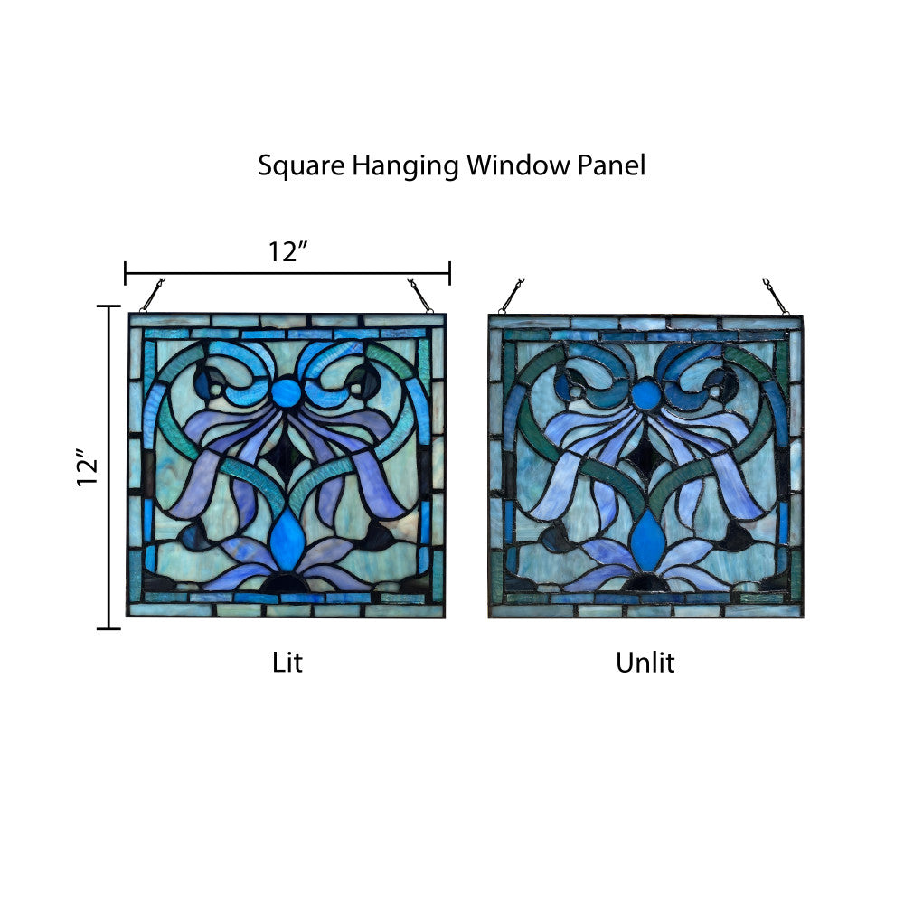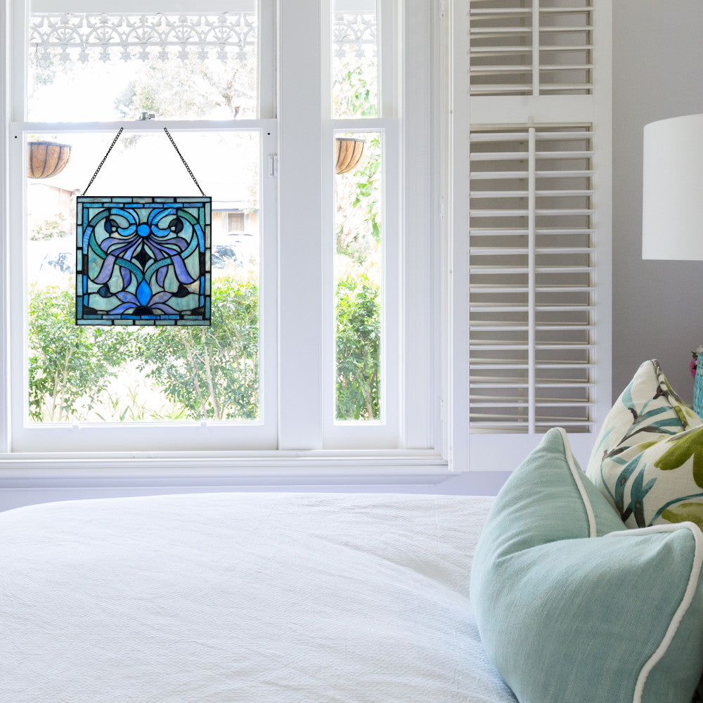 Hang this cottage-inspired stained glass window panel in any sunny window for a cheery, inviting decor accent. Handcrafted from 113 individual glass cuts, this stained glass suncatcher is created by-hand using the traditional copper foil soldering method for a unique look. It features a traditional-style geometric floral design in blue, purple and green hues that become more vibrant when light passes through the glass. Plus, the window panel comes with an attachable hanging chain for easy display in your living room, dining room or entryway.