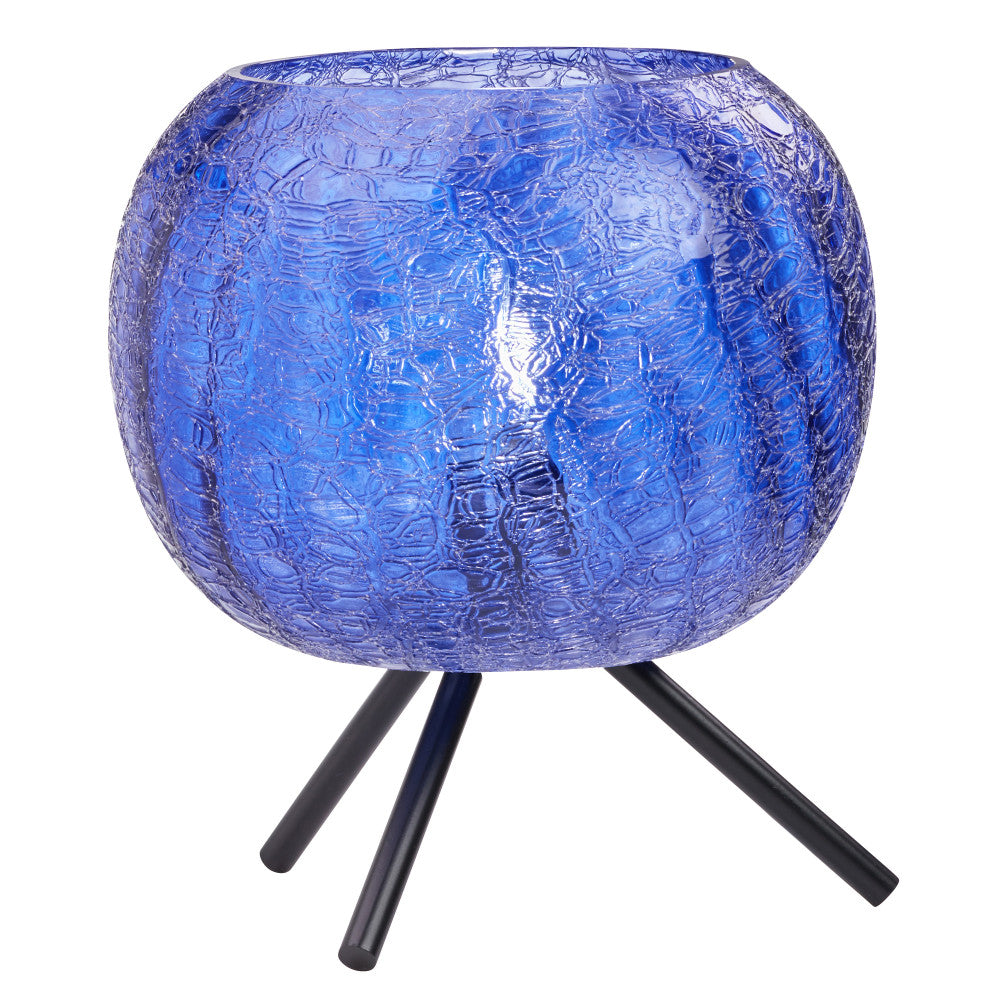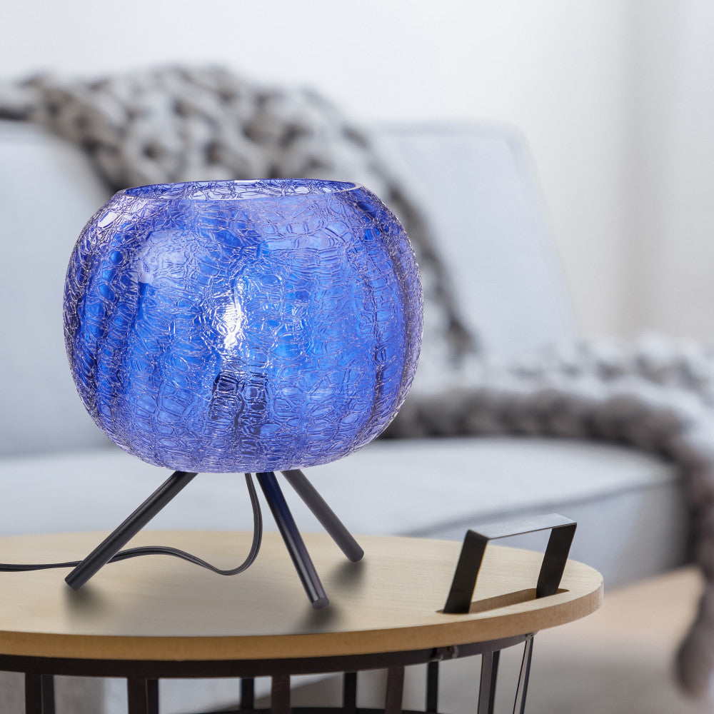 This bohemian-style table lamp features a unique globe-shaped shade crafted from textured blue glass that diffuses light in a multi-directional manner, creating a captivating play of light in your space. The lamp's tripod base, made from metal with a black finish, adds an element of industrial-chic to the design. This lamp uses a Type B bulb (not included) and features an on-off line switch for easy operation. Care is as simple as a wipe down with a dry cloth.