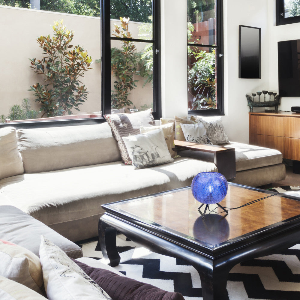 • Bohemian-style table lamp with a black metal tripod base and a globe shade made from textured blue glass