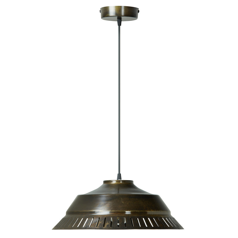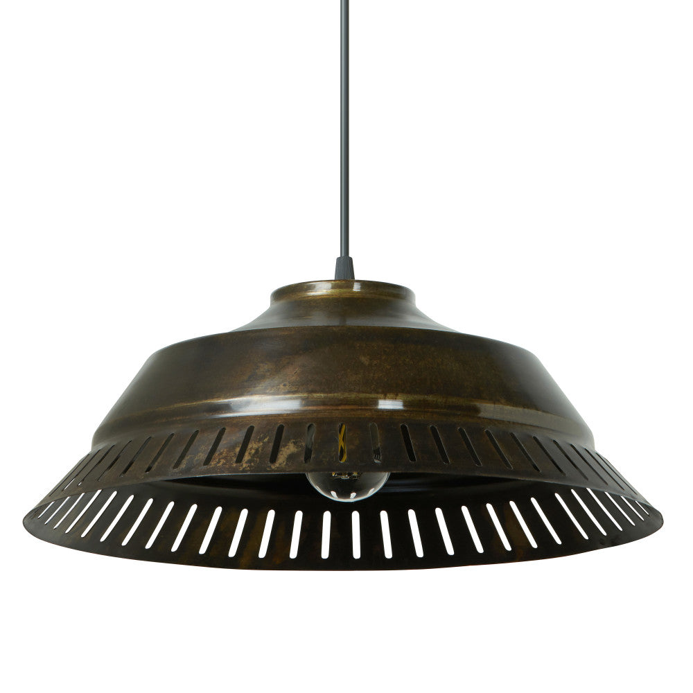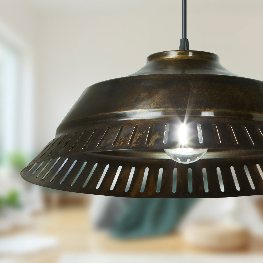 This cool industrial pendant light brings a standout look to your interior lighting. Featuring an antique bronze-finish round metal canopy and an antique bronze-finish metal cone shade with bottom cutouts, it makes a great addition to your modern kitchen or transitional-style living room. The pendant hardwires into the ceiling and casts a warm glow with one Type A 40-watt bulb (not included). Plus, the adjustable hanging cord lets you set the drop height between 8 inches and 67 inches to best suit your space.