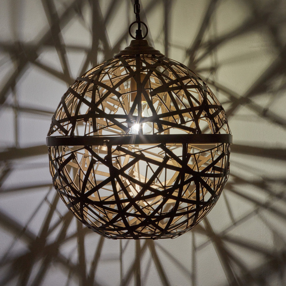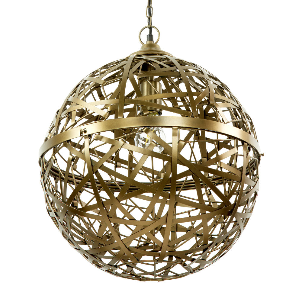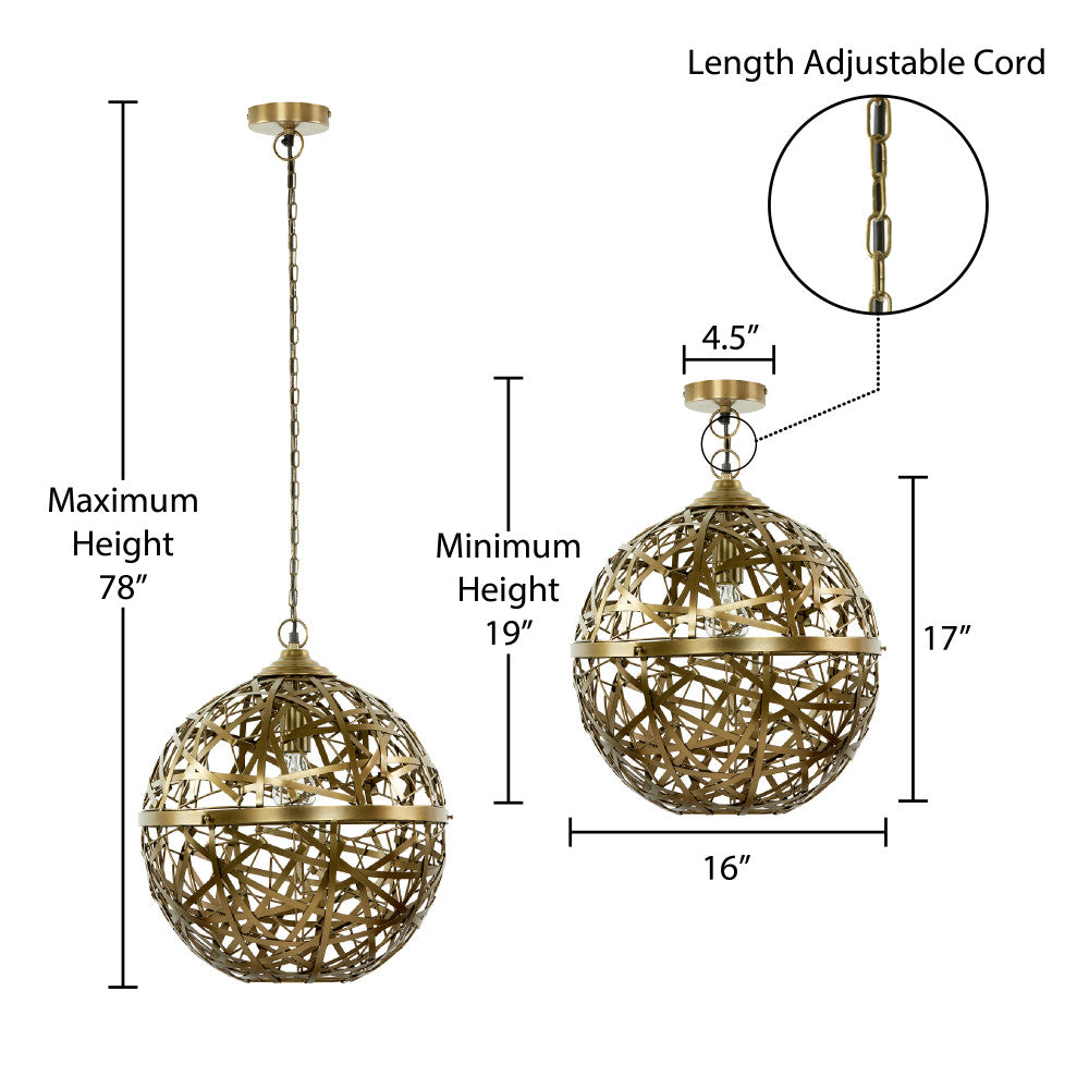 Spice up your interiors with this industrial-style pendant light. Its abstract cut-outs and orb design add an artistic touch to any space, while its antique brass finish lends a hint of vintage charm. This pendant is handcrafted from metal, ensuring each piece has its own unique character. This light fixture casts multi-directional light, creating an inviting and cozy ambiance. With an adjustable hanging height, it's easy to customize the look to suit your space. Whether it's in the kitchen, dining room, or living area, this pendant light adds an element of sophistication and style. Requires one 40-watt or compatible LED or CFL bulb, bulb not included.