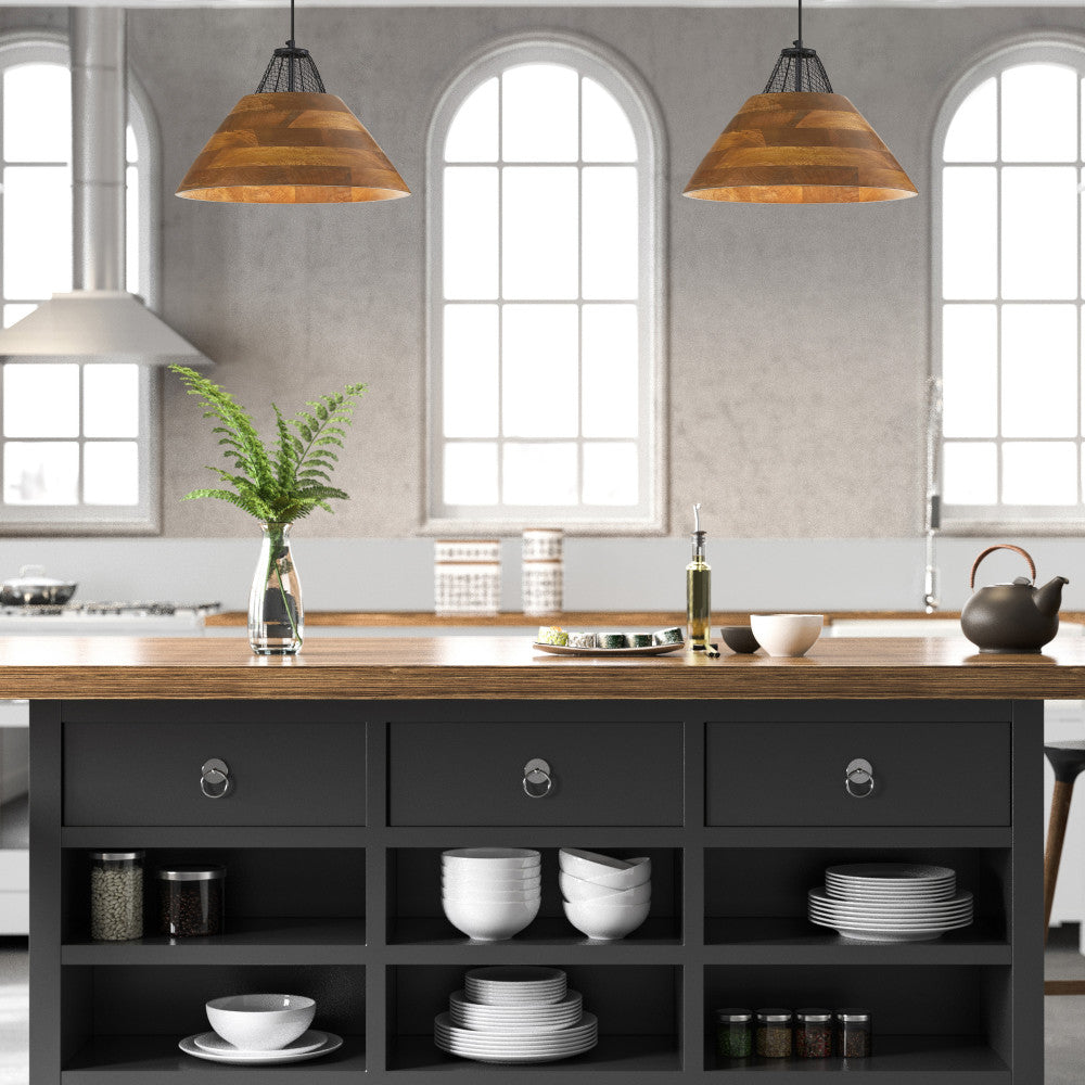 This elegant hanging pendant light makes an eye-catching addition to your kitchen, living room or foyer. Showcasing a black-finish round metal canopy and a black metal cage detail attached to a cone-shaped walnut-stained wood shade, this mixed-material pendant pairs well with modern or industrial décor. It casts a warm glow with one 40-watt Type A bulb (not included). And thanks to the adjustable hanging cord, you can easily set the drop height between 12.75 and 71.75 inches to best fit your space.