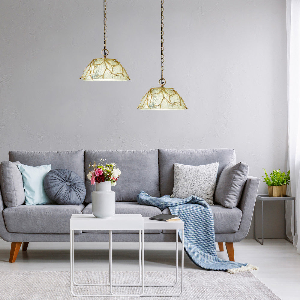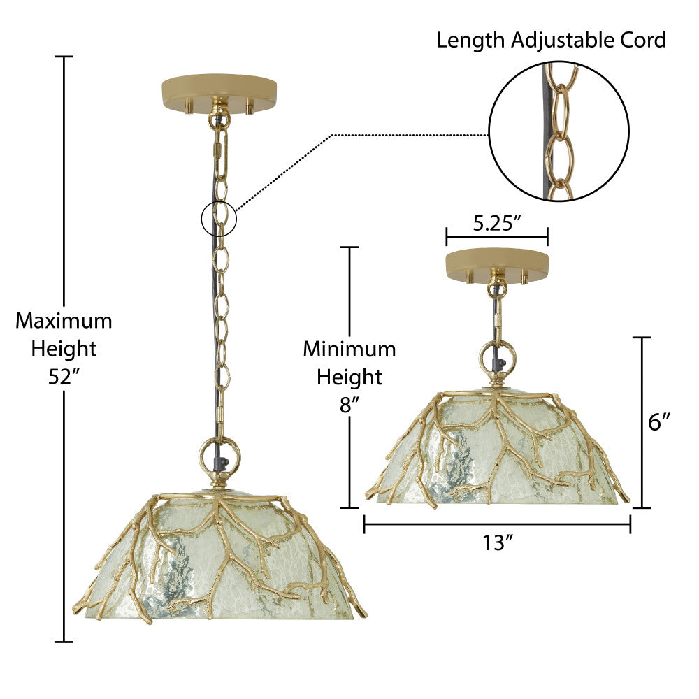 For a cottage inspired or bohemian & eclectic décor scheme, this gold-finish metal and glass pendant light makes a perfect pick to add overhead lighting while enhancing the look of your living space. Featuring an ornate branch-like gold-finish metal frame with a painted silver glass oval-shaped dome shade inside, this adjustable-height pendant lamp can also be installed at a variety of heights when hard-wired into your ceiling. Great for an entryway, dining room or kitchen, this handcrafted pendant light requires one 40W or equivalent light bulb, not included.