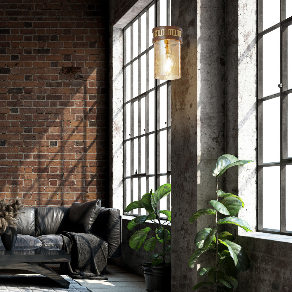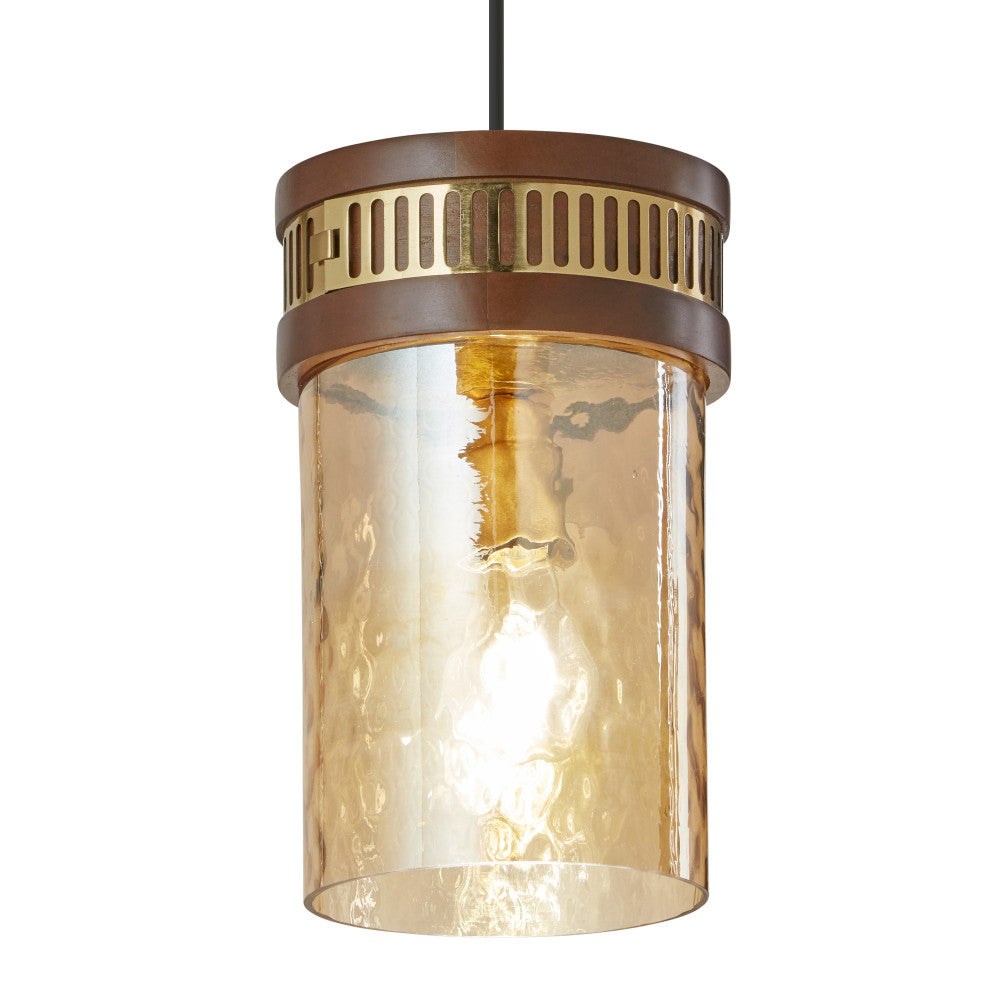 6.5" 1-Light Gold Pendant Light with Textured Glass Brown Mango Wood and Amber Glass Cylinder Shade