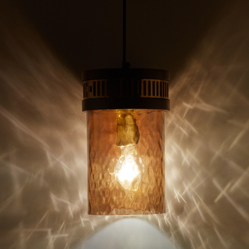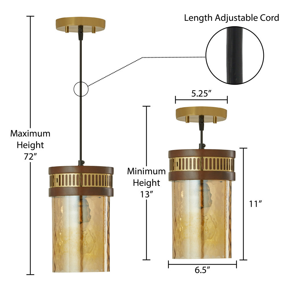 The elegant, mixed-material look of this hanging pendant light makes a perfect addition to the lighting in any room in your home. Showcasing a round gold-finish metal canopy and an amber textured glass cylinder shade with brown mango wood and gold-finish metal accents, this stylish pendant makes a great pairing with bohemian and modern decor. The pendant casts a warm glow with one 40-watt Type A bulb (not included). And thanks to the adjustable hanging cord, you can set the drop height between 13 and 72 inches to best fit your space.
