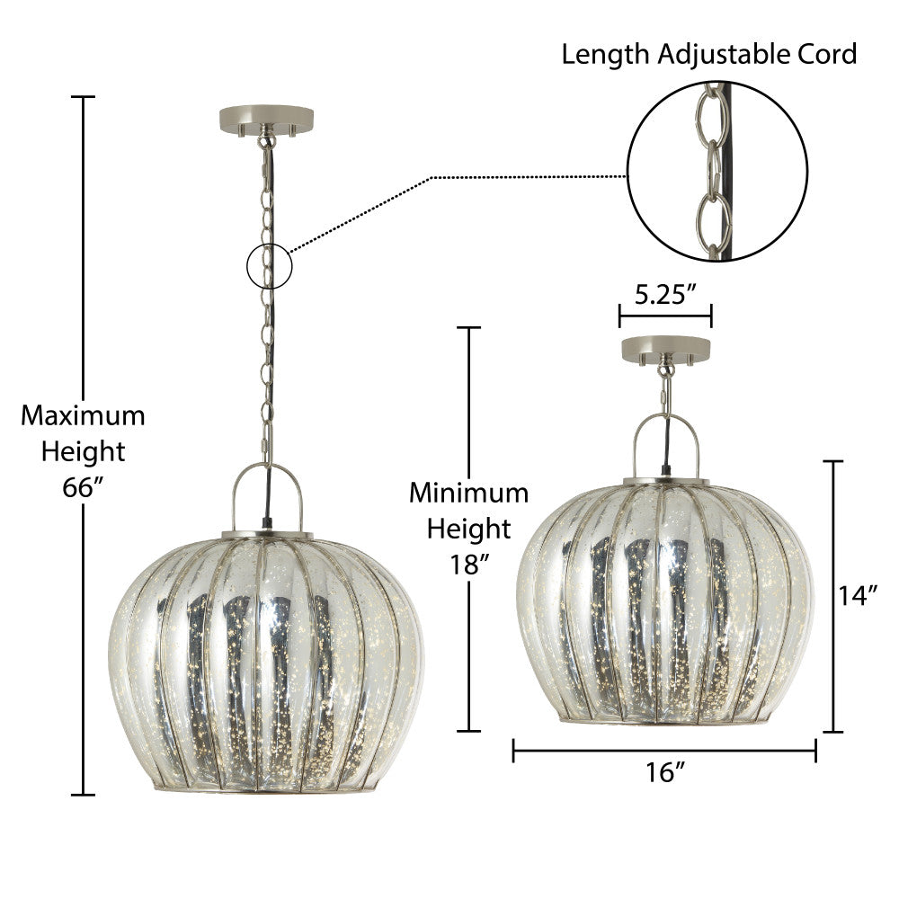 This hanging pendant light makes an excellent pairing with both modern and glam-style decor. Featuring a painted nickel-finish metal canopy and a painted silver mercury glass globe shade for a touch of style, it casts soft, bright light with one 40-watt E26 bulb (not included). Plus, it also comes with an adjustable hanging cord that lets you set the height anywhere from 18 to 66 inches to best fit a variety of spaces.