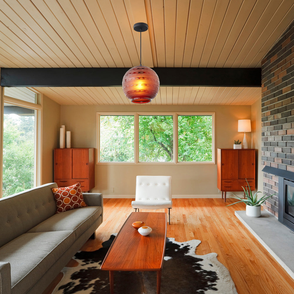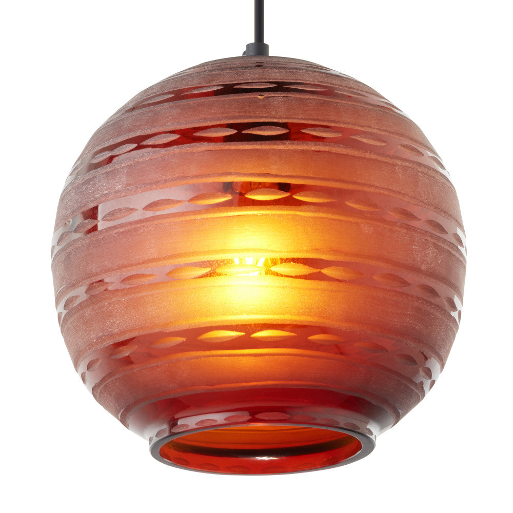 Presenting a modern pendant light adorned with a black painted canopy and a hand-blown, red colored, globe-shaped glass shade. This unique piece is sure to be the focal point of any room, casting a warm, multidirectional light. The height is adjustable, allowing you to customize the placement according to your preferences and room's design. The unique hand carved pattern in the shade adds an artistic flair to this multi-directional light fixture, all while beautifully showcasing the light from one 40 watt, Type A incandescent, CFL, or LED bulb (not included). The red and black color scheme presents a bold and striking contrast that adds a vibrant touch to your space.