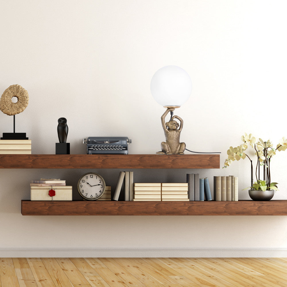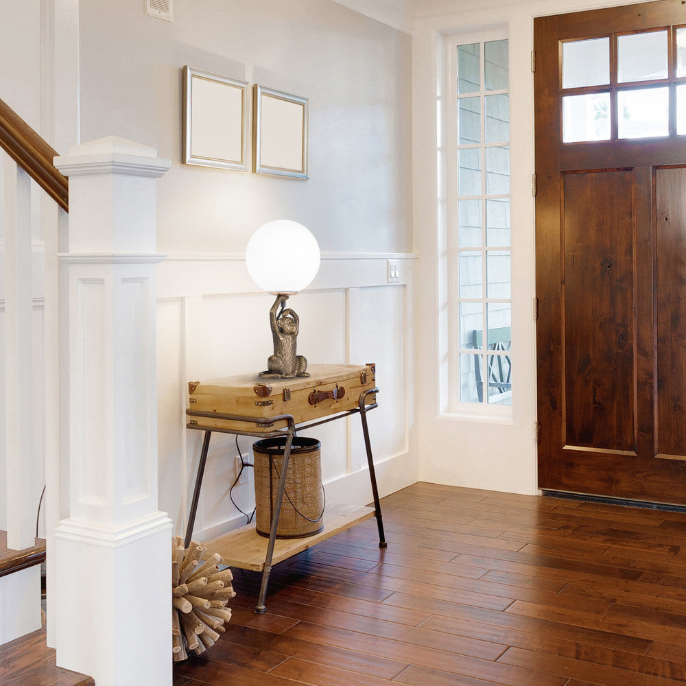 Add a touch of whimsy to your space with this charming table lamp, featuring a playful gold monkey figurine holding a frosted blown glass globe shade. The lamp's novelty design and vibrant gold and white color scheme will bring a bohemian flair to any room. Its warm light casts a cozy ambiance, making it ideal for a desk or accent table. This lamp requires one 15-watt bulb, compatible with incandescent, CFL, or LED options, bulb not included. UL listed for safety, it is meant for indoor use, offering an eye-catching and functional piece to enhance your decor.