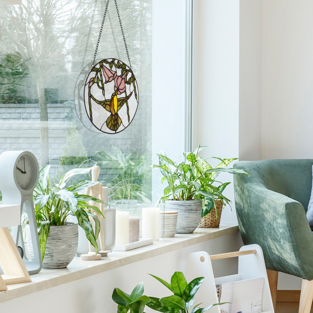 This hummingbird stained glass suncatcher window panel adds a whimsical touch to any indoor space. Made from 121 individual glass cuts in green, pink, and yellow hues on a clear background with one cabochon, this window panel showcases a green hummingbird amongst hibiscus flowers. The textured clear background contrasts beautifully with the other vibrant colors, and the panel will blend seamlessly with a cottage, farmhouse or French country home decor scheme. Plus, a 24-inch metal link chain is included for easy hanging in a sunny window.
