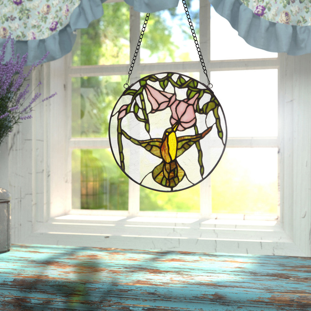 10"H Hummingbird and Hibiscus Round Stained Glass Window Panel