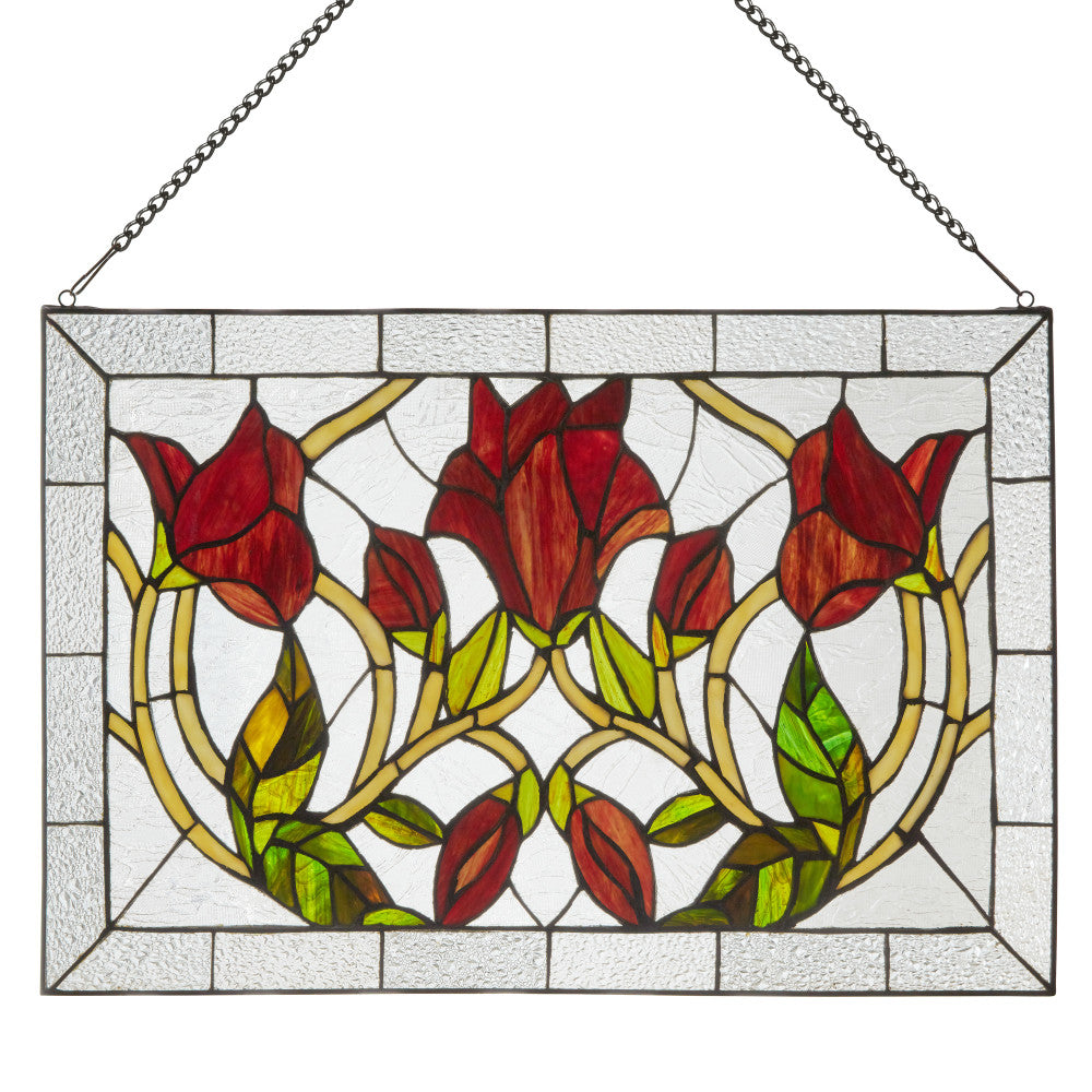 No matter the season, this gorgeous stained glass floral vine will always be in bloom. Handcrafted from 182 individual cuts of red, green, and clear Tiffany-style stained glass, the stunning blooms on this 24-inch decorative window panel come alive with the sun's rays against a clear glass background. A lovely gift for Mother's Day, a special anniversary, or for the gardener in your life, this stained glass window panel is easy to display in a kitchen or bedroom window or in the sunroom, thanks to the 32 inch included metal chain.
