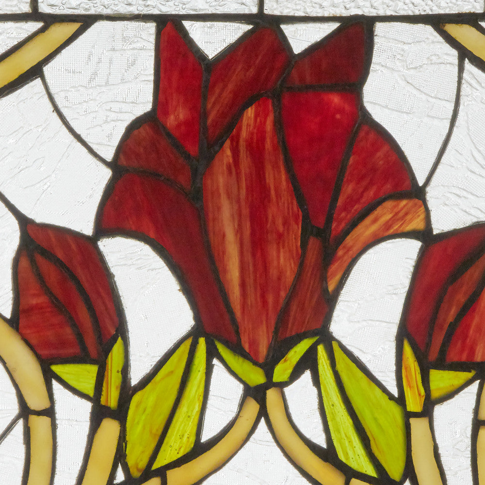 Stained glass window panel features a lovely flowering vine in red, green, and clear