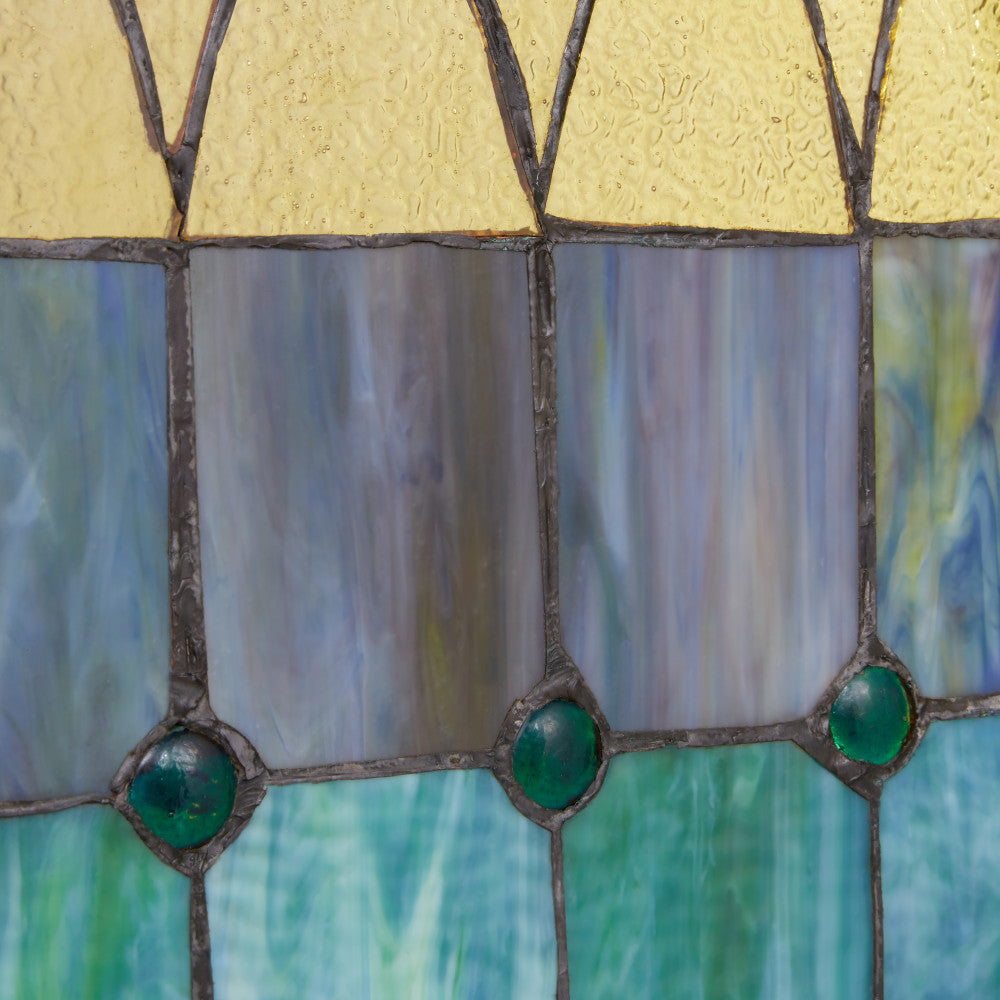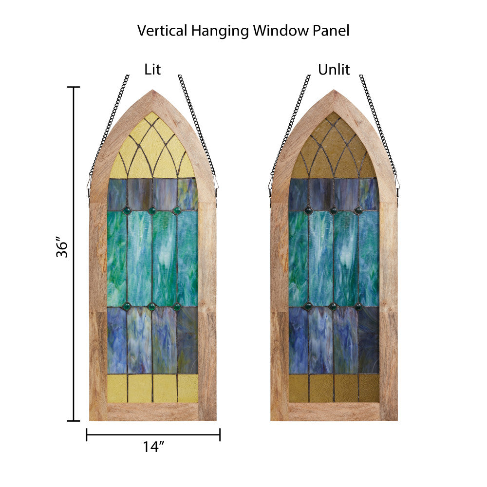 This traditional Tiffany-style window panel features a captivating display of 26 pieces of striated and textured stained glass in a symphony of aqua, blue, green, and yellow shades. The cathedral-inspired design is accentuated by six cabochons and presented in a rich mango wood frame for a touch of elegance. When illuminated by sunlight, the vibrant hues and intricate patterns of the handcrafted stained glass come to life, creating a stunning visual display. Its Victorian theme adds a timeless appeal to any space. Whether hung in a sunny window or leaned against a wall, this window panel will surely be a mesmerizing centerpiece in your decor.