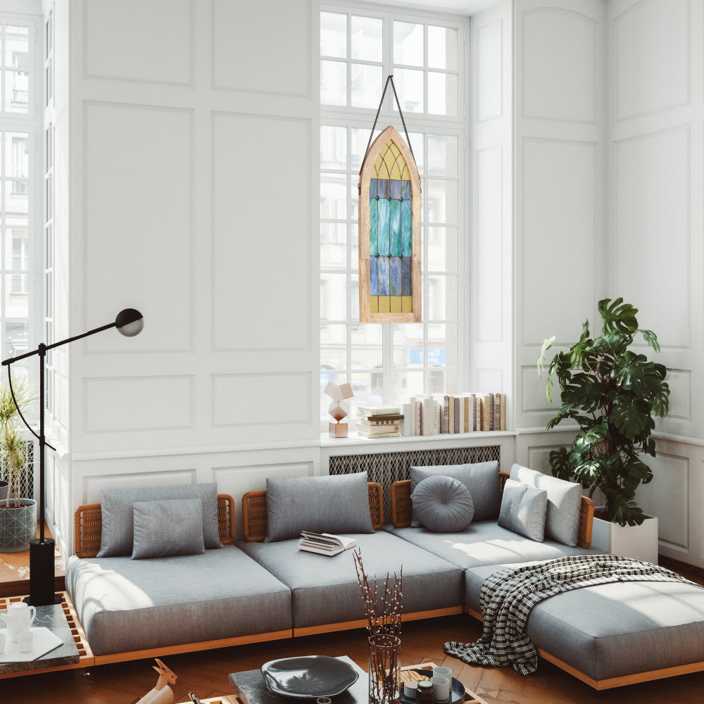 36" H Aqua Victorian Cathedral-Inspired Stained Glass Window Panel