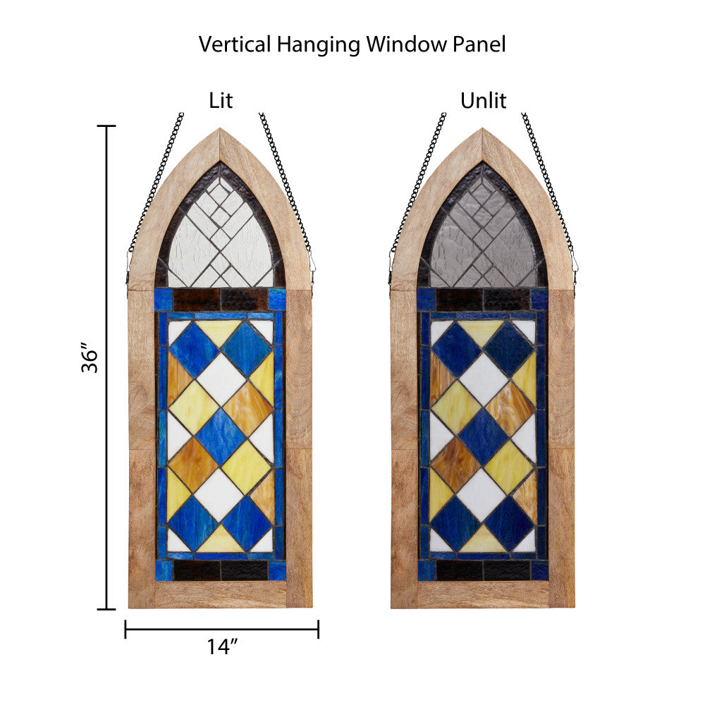 This traditional-style window panel featuring a Victorian checkerboard pattern brings a touch of elegance to your home. The panel is handcrafted with a unique design, featuring 75 cuts of stained glass in a blend of blue, yellow, white, and brown/black, set in an arched mango wood frame. The checkerboard pattern is complemented by clear textured glass at the top, with deep brown/black textured glass framing the design, adding sophistication to any room. When placed in a sunny window, the colored glass comes to life, creating a stunning display of light and color. This window panel is not only a beautiful piece of art but also a unique home decor item that can enhance any living space.