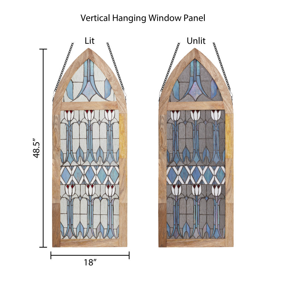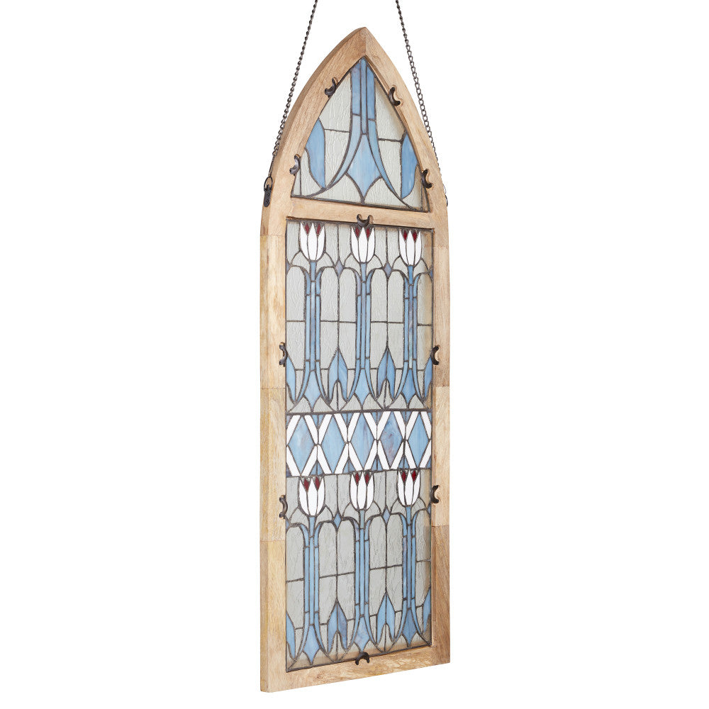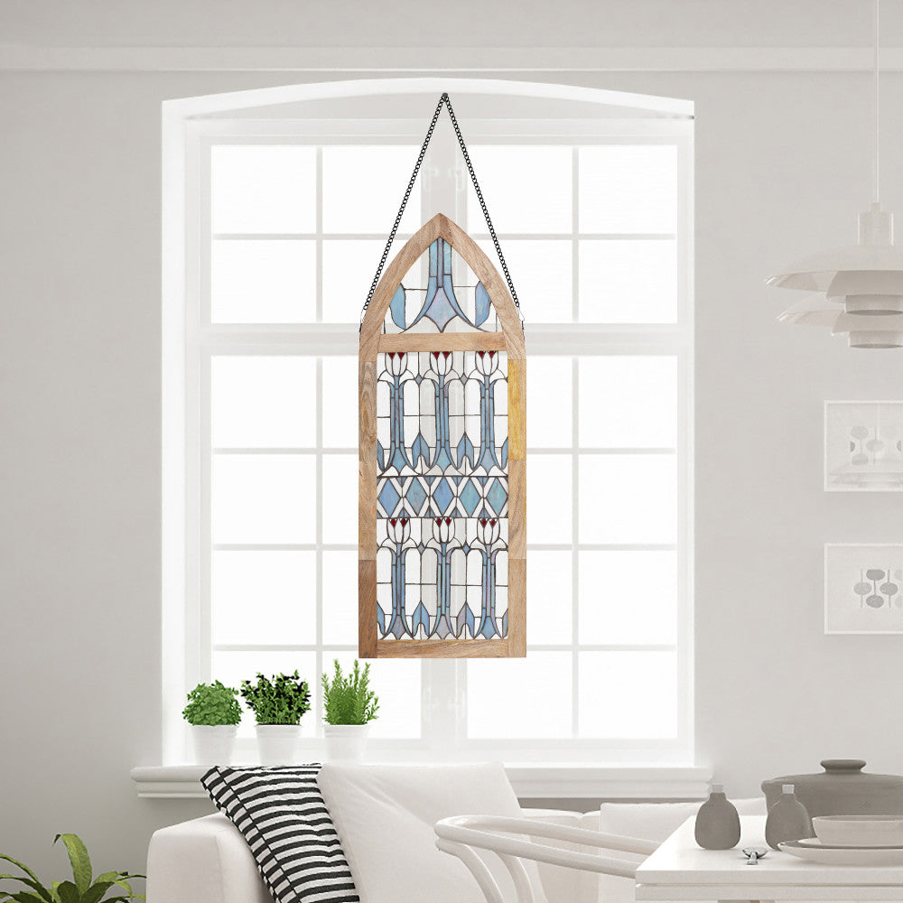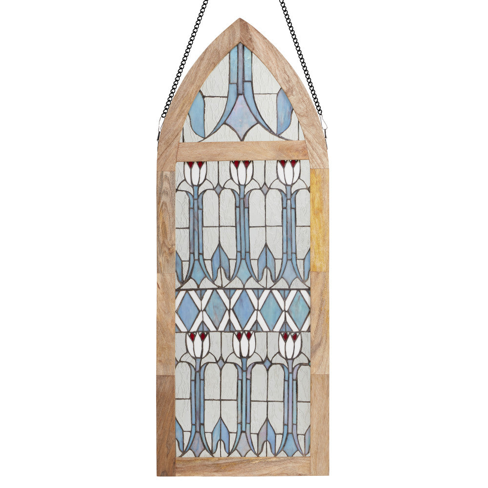 Infuse a vintage charm into your space with this art deco-inspired stained glass window panel. This cathedral style window panel showcases a stunning floral pattern featuring tulips made from 270 pieces of hand cut stained glass, bringing a touch of elegance to any room. The textured and striated stained glass in shades of blue, red, white, and clear is beautifully framed in a mango wood frame. Whether hung up or leaned against a wall, this handcrafted window panel will enhance and catch the light in the most beautiful way.