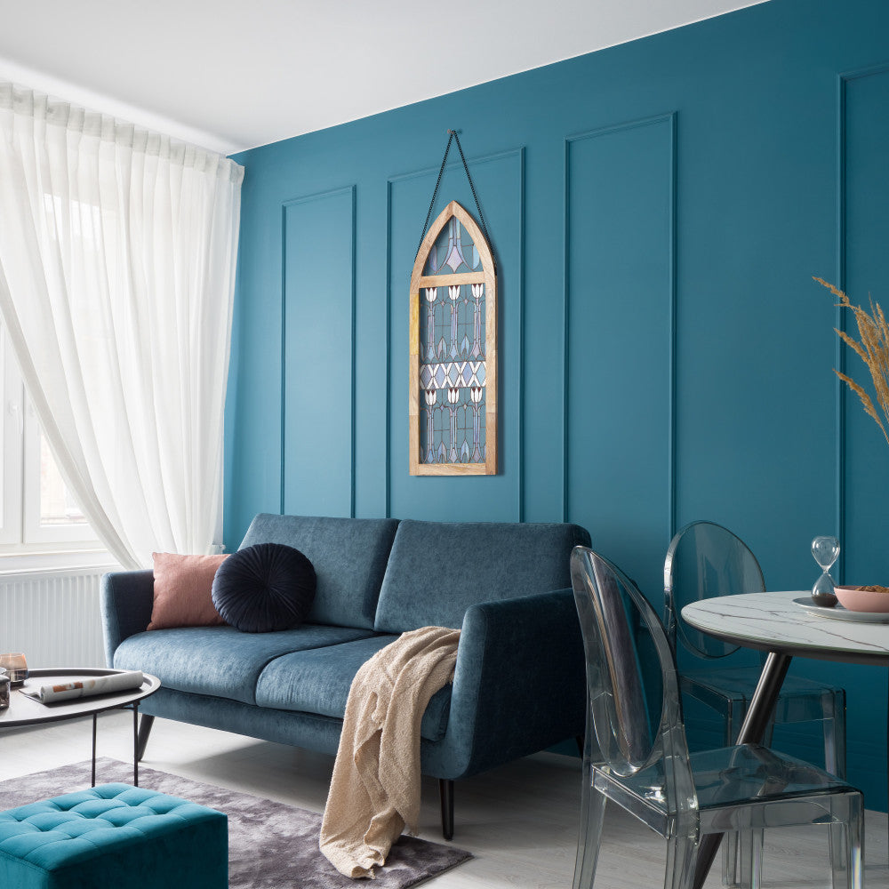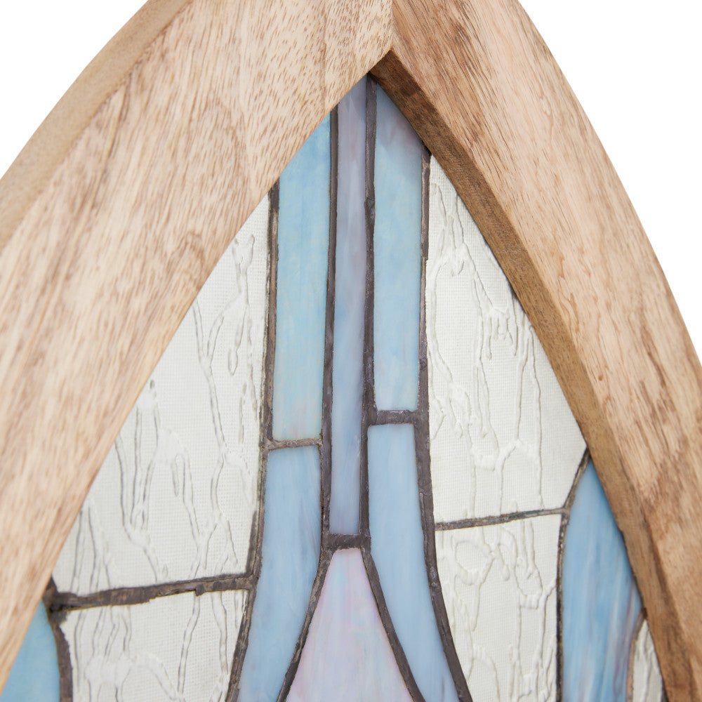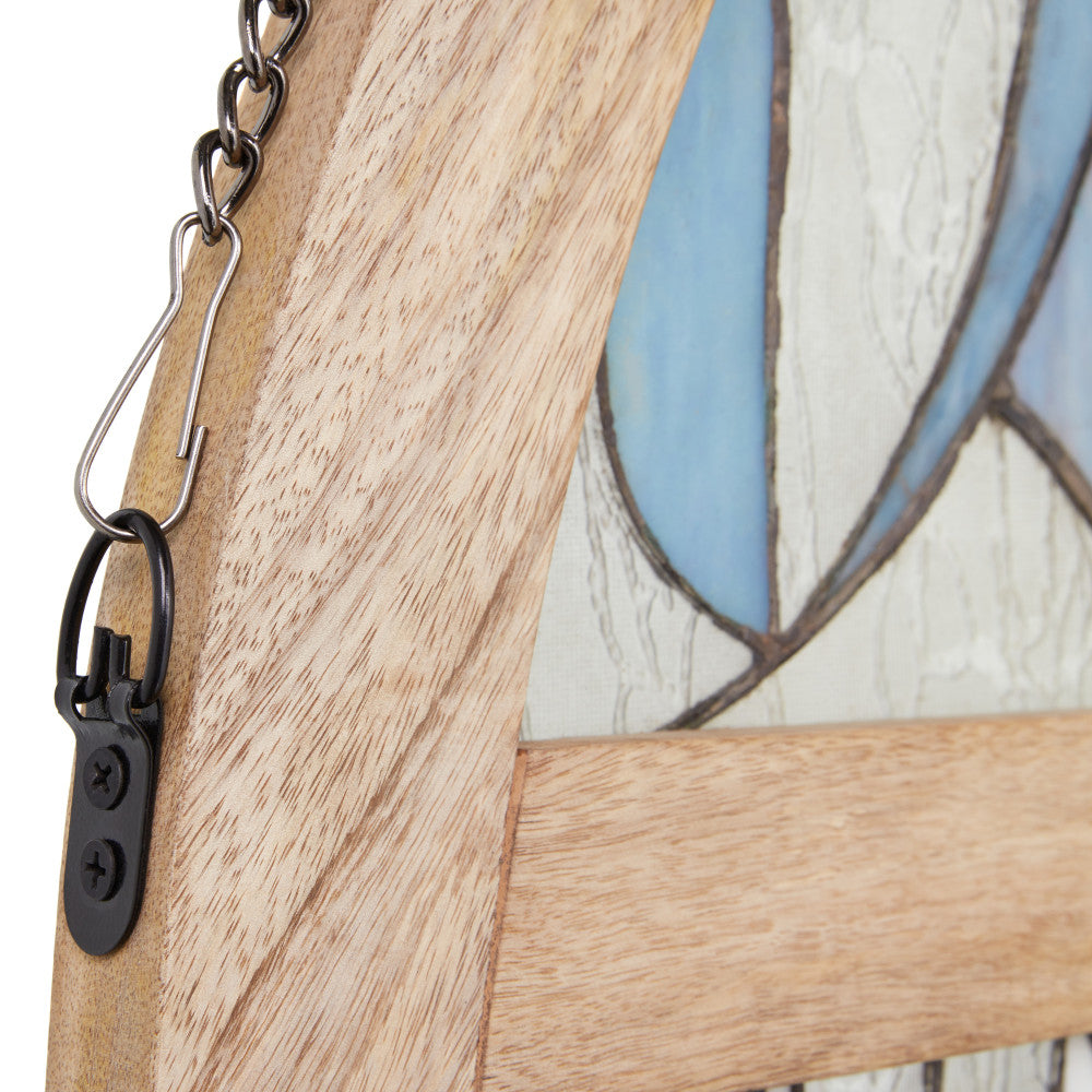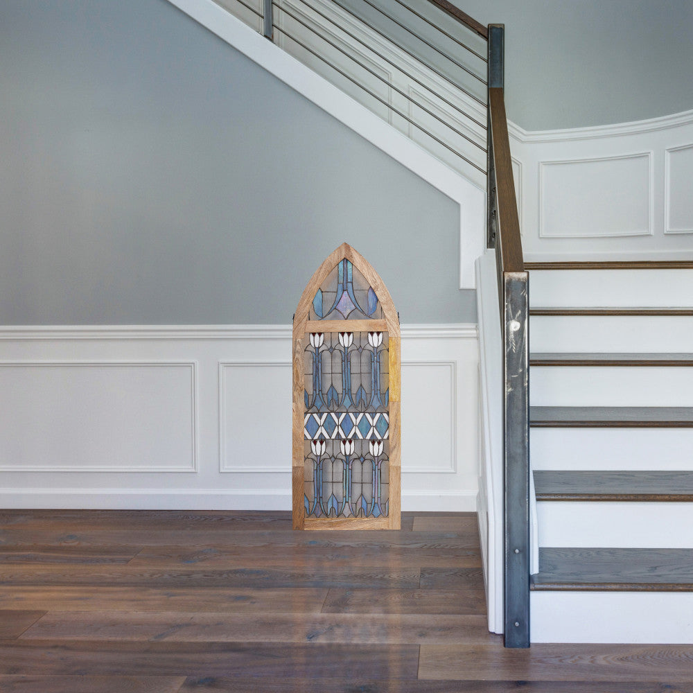Infuse a vintage charm into your space with this art deco-inspired stained glass window panel. This cathedral style window panel showcases a stunning floral pattern featuring tulips made from 270 pieces of hand cut stained glass, bringing a touch of elegance to any room. The textured and striated stained glass in shades of blue, red, white, and clear is beautifully framed in a mango wood frame. Whether hung up or leaned against a wall, this handcrafted window panel will enhance and catch the light in the most beautiful way.