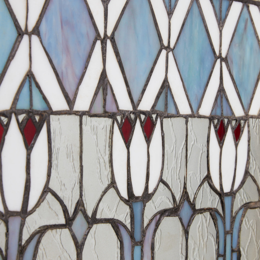 • Incorporates 270 hand cut pieces of glass hues of blue, red, white, and clear