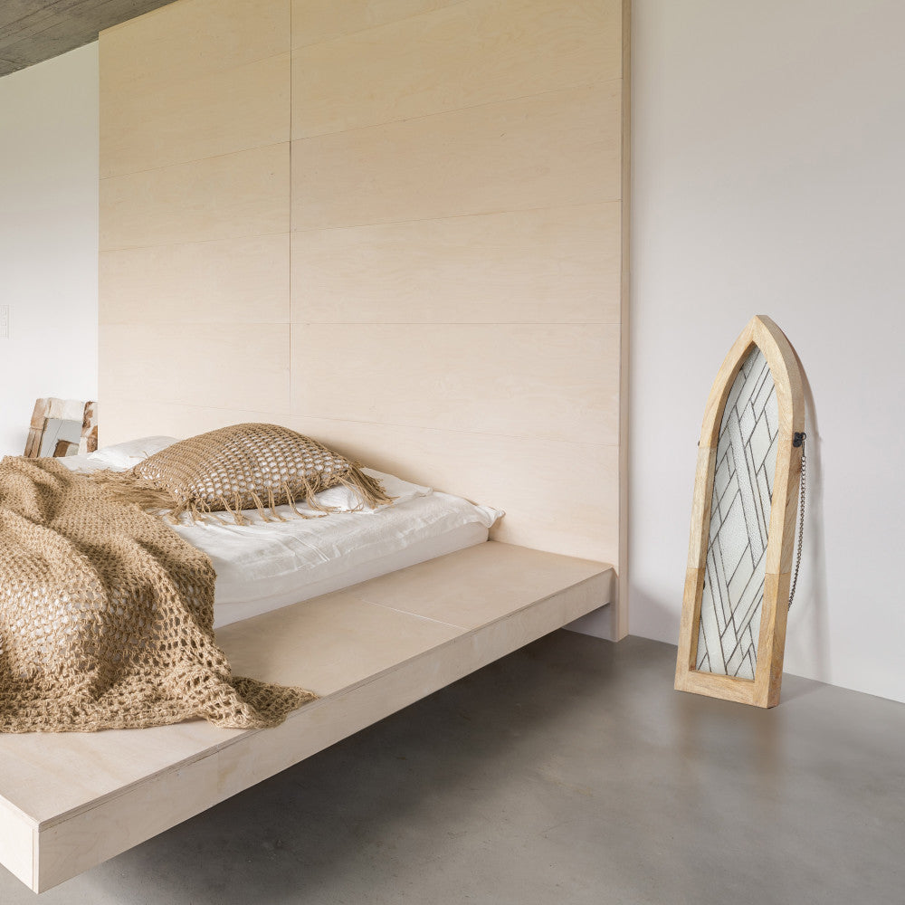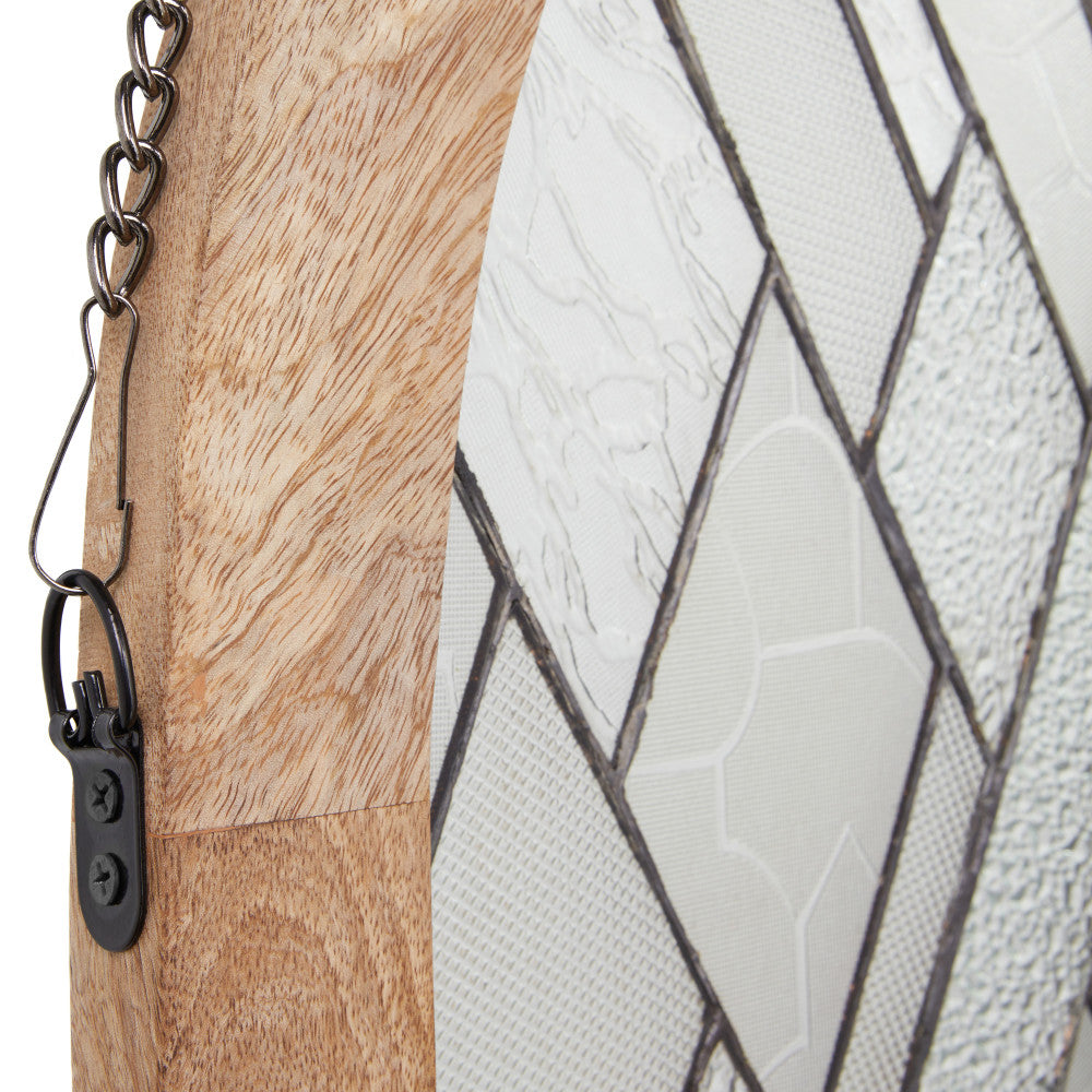 Embrace the minimalistic beauty of clear glass in your home with this modern geometric cathedral-style window panel. The panel showcases an exquisite array of 42 geometric cuts, made from various textured clear glass, set within a mango wood frame. The slanted geometric design offers a unique, contemporary look. This stunning piece can be hung up or leaned against a wall, allowing you to incorporate it into your interior design in a variety of ways. Whether you place it in your living room, dining room, or study, it's sure to add a touch of sophistication and elegance.
