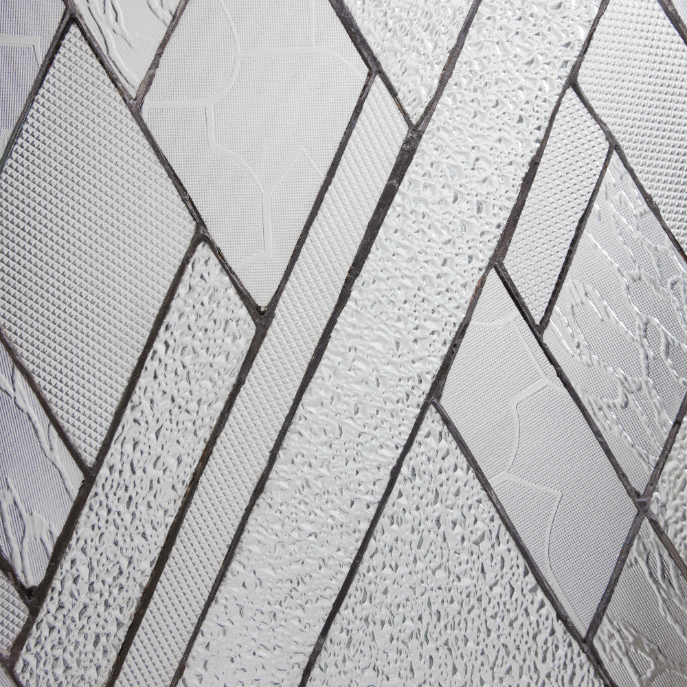 Features a cathedral style with 42 geometric cuts made from various textured clear glass
